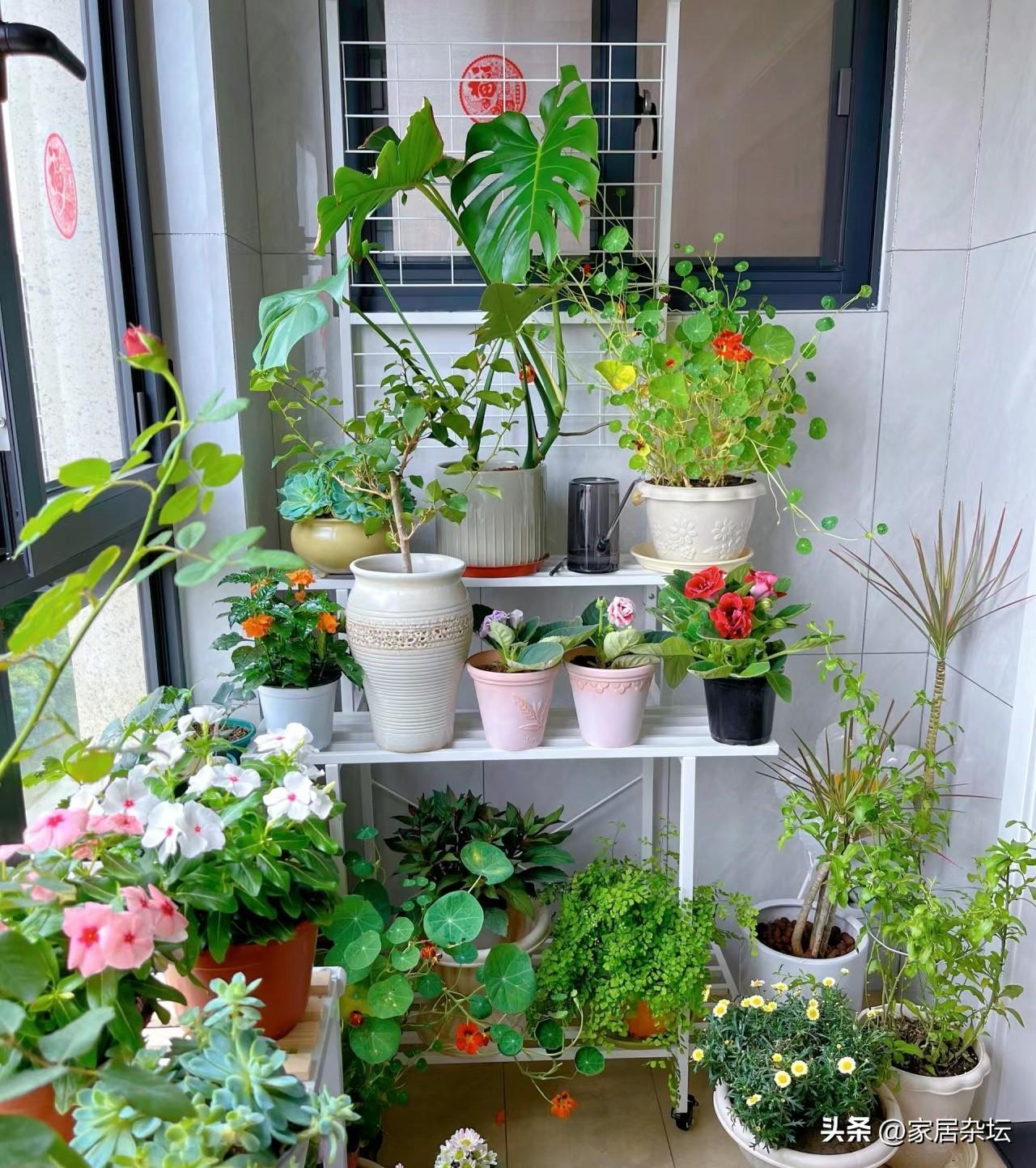 ①、合理的設置花架,分層佈置。讓我們的陽臺,有更多的擺放綠植、擺放花的空間。