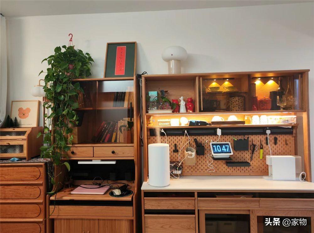 靠牆的地方,依次擺放着餐邊櫃書桌和收納櫃,都是櫻桃木材質的,和家裏這種略帶復古的原木風相呼應,呈現出一種溫柔有氣質的感覺,住在其中很是舒服。