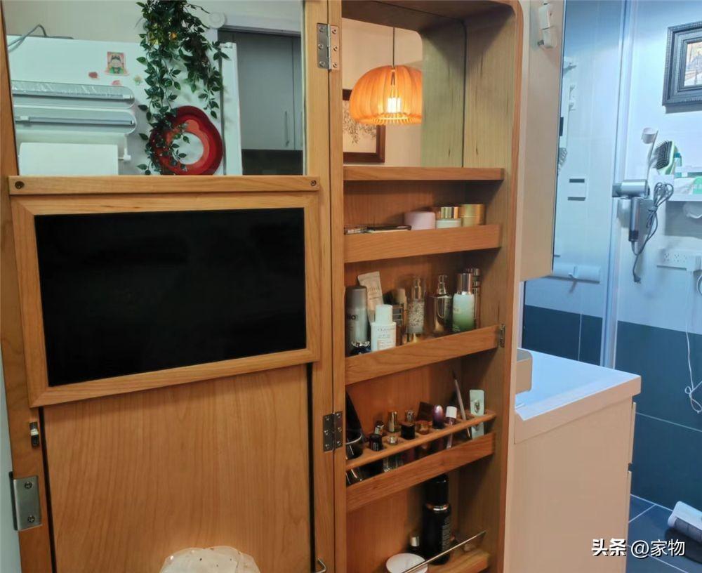 我個人是真喜歡這種櫻桃木的鏡櫃,它挨着衛生間,關上時就是一個全身換衣鏡,但打開以後才發現,裏面是內有乾坤,不僅有手寫板,還有多層收納空間,方便女主人收納各種化妝品。