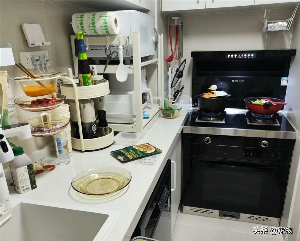 至於廚房,它在衛生間的斜對面,是一間狹窄的L形廚房,平時只能容納一人做飯,通過吊櫃和底櫃的相互搭配,倒是能將各種各樣的雜物收納其中,避免收納空間不足導致太過雜亂。