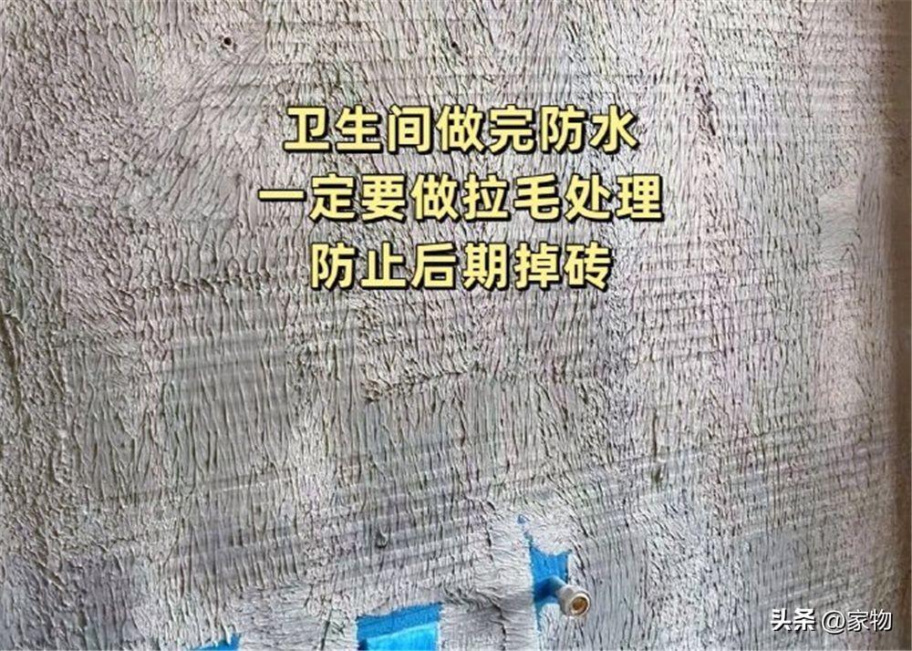 衛生間防水做完以後,爲了能避免掉磚,最好是能做個拉毛處理,如果是小磚的話倒是不用太過在意,但如果是大磚上牆,我個人感覺這一步必不可少,防止掉磚很有必要。