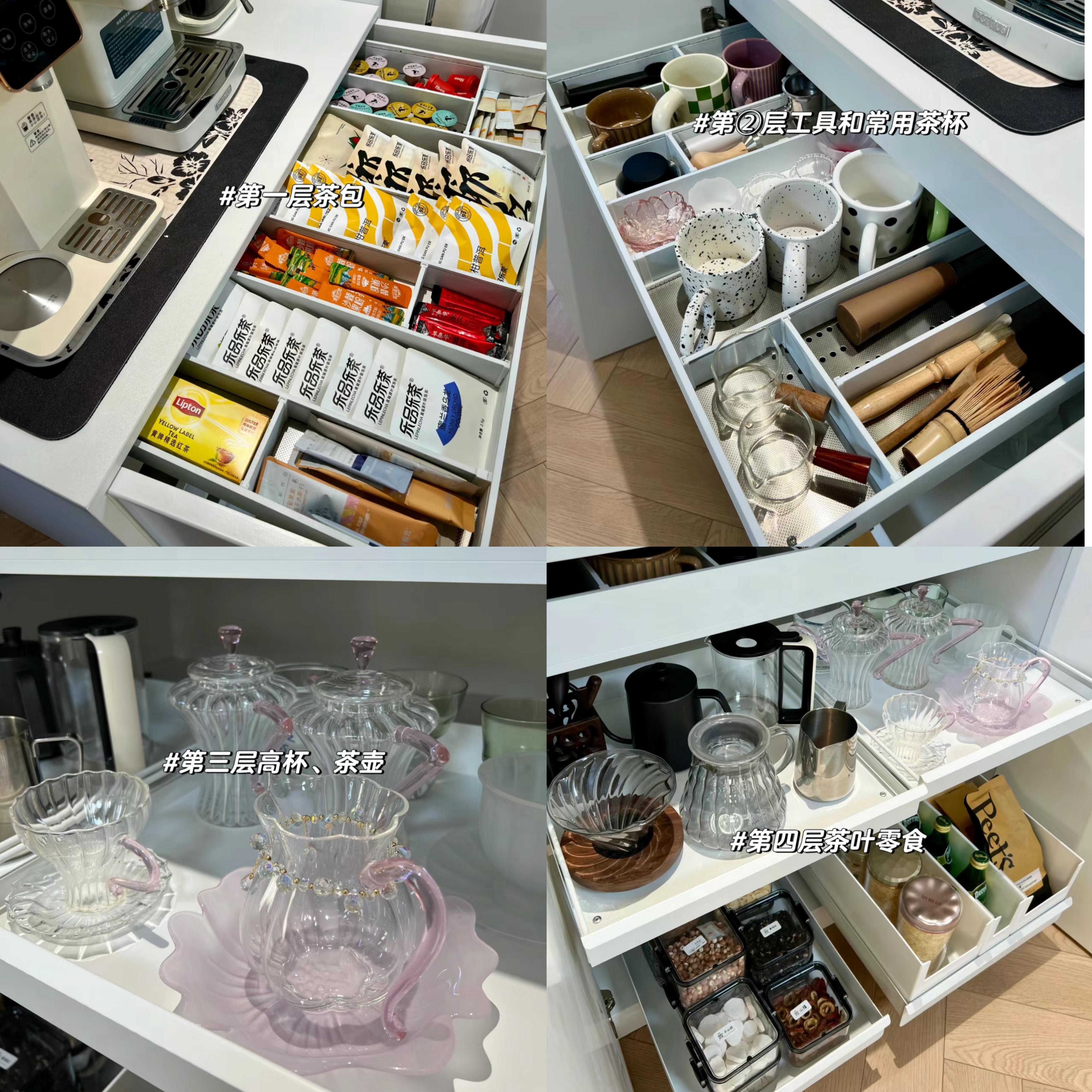 第一層茶包、第二層杯子和工具、第三層高一點的大杯子和茶壺,第四層臨時、茶葉、雜物等。