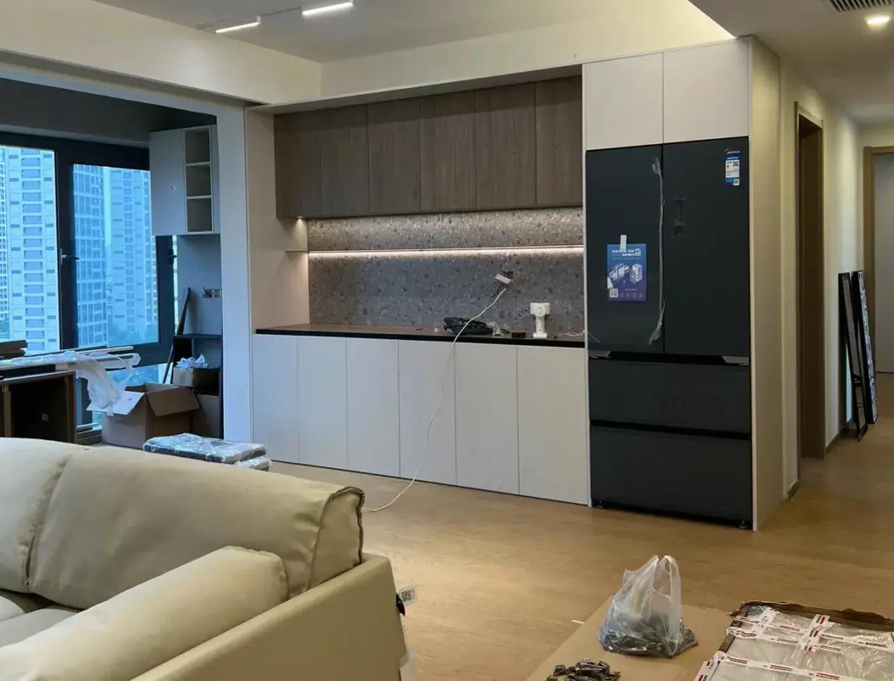 這時候,可能會面臨一個問題,冰箱和餐邊櫃的厚度不同,冰箱即使買平嵌的也得60cm的厚度,而餐邊櫃則一般是35cm的厚度。