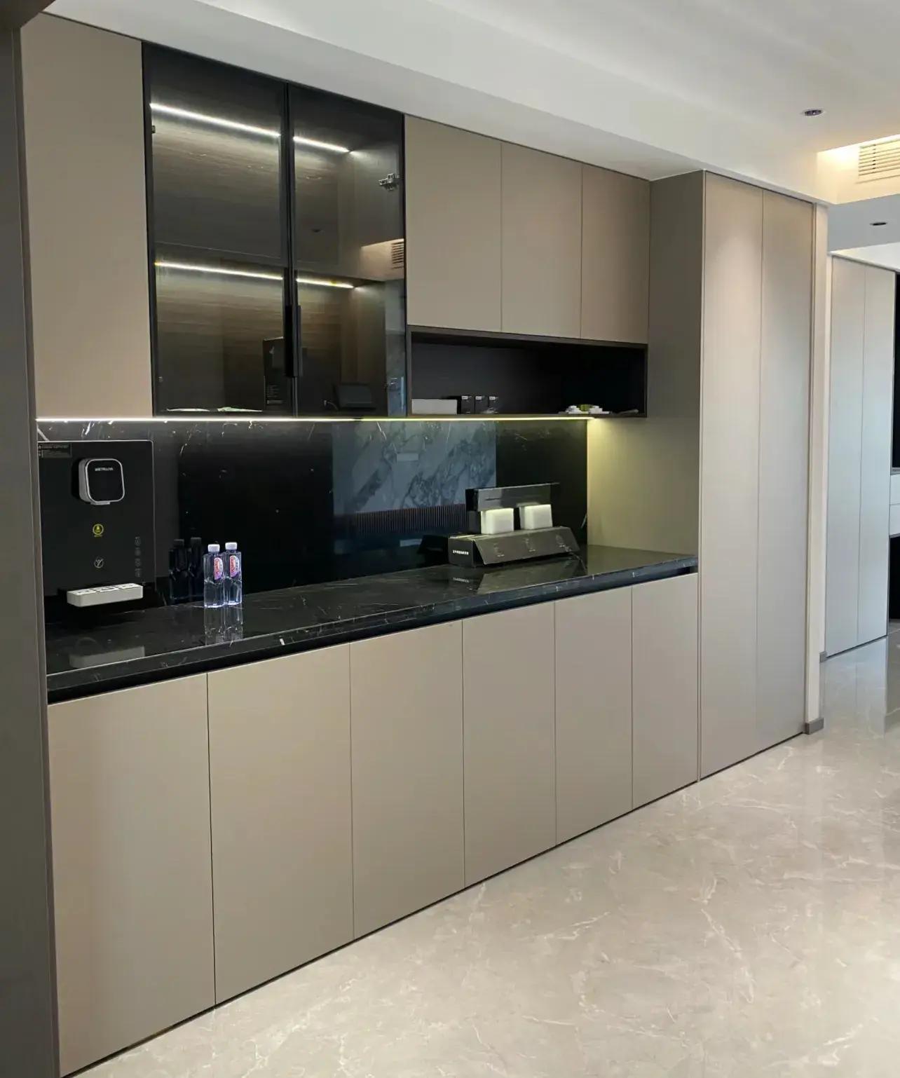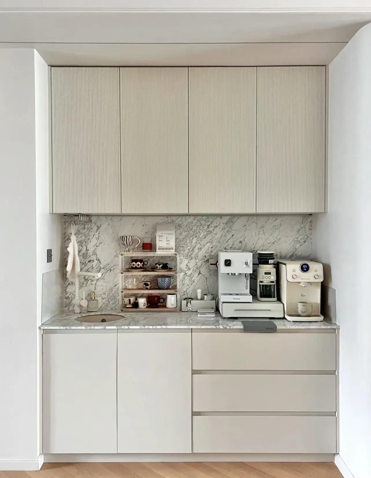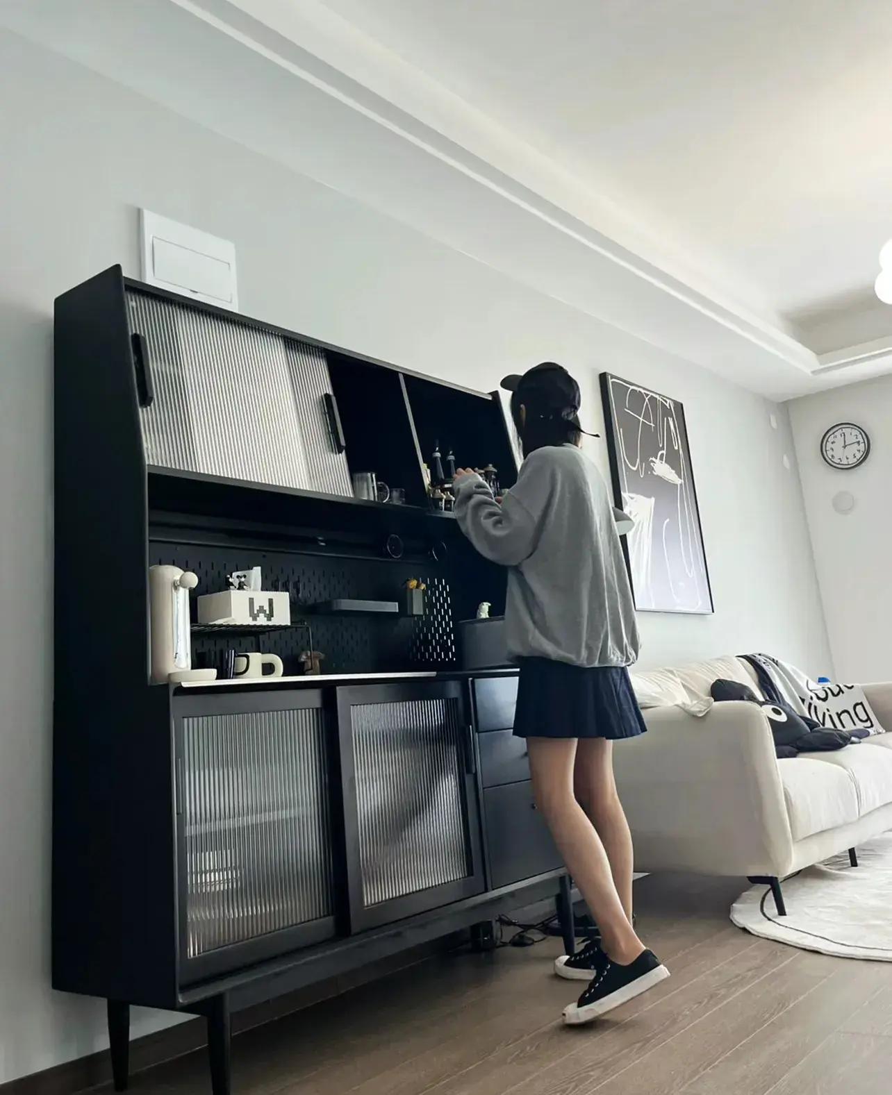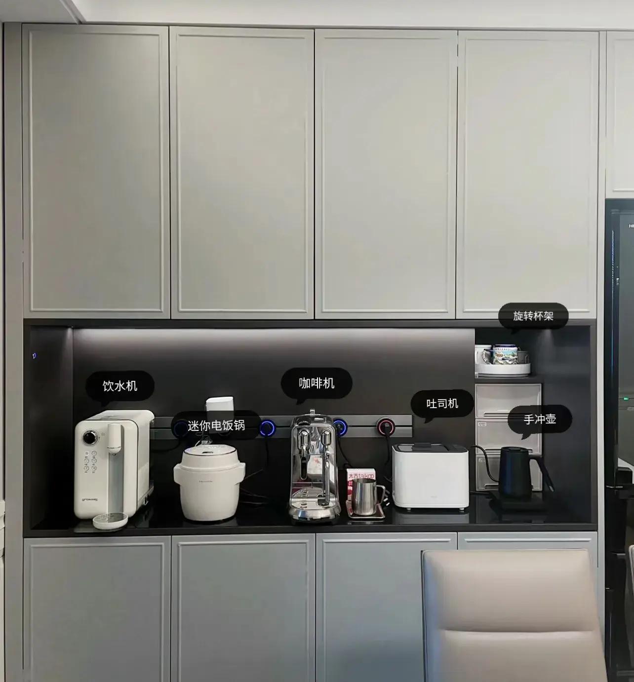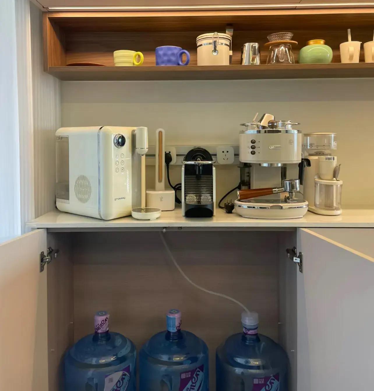 嫌自己添水麻煩,可以弄一個茶吧機,把桶裝礦泉水,收納在餐邊櫃開放格下面的櫃子裏。