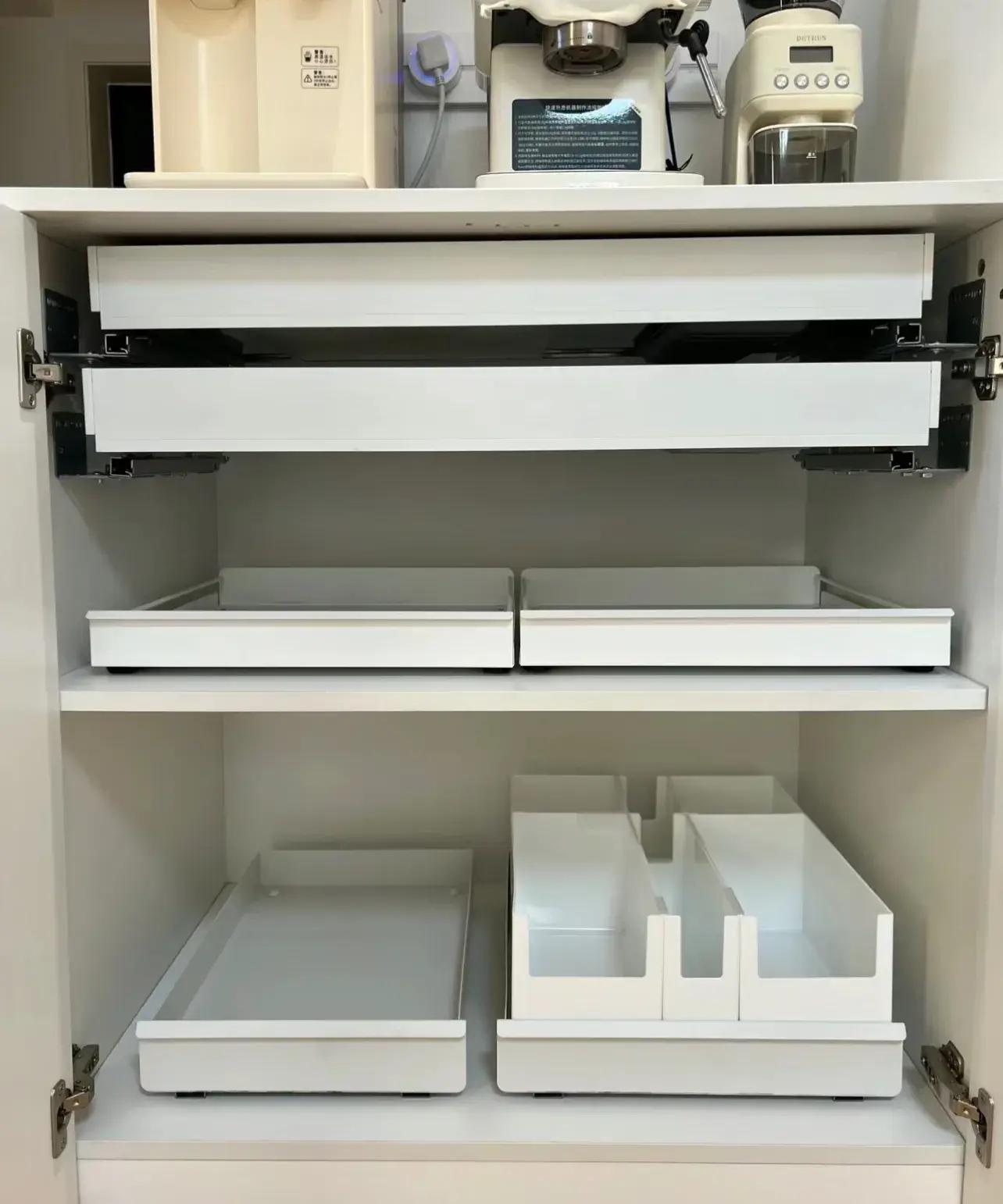 如圖,就是利用抽屜軌道+收納盤來改造的抽屜。