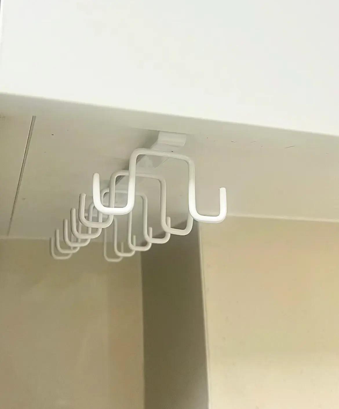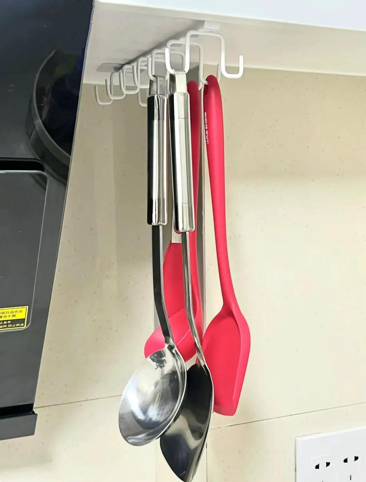 在使用中,樣式奇怪,反而成了它的優勢,雙排掛鉤簡直不要太實用,家裏的各種鏟、勺、刷、削皮刀,都能往上掛,十幾個掛鉤生怕你掛不滿。