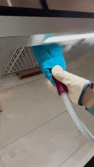 咱們可以在出氣口上,套一個比較透氣的抹布,接着打開蒸汽,用來清理廚房瓷磚上的油污,或者櫃門上的油污,簡直一絕。