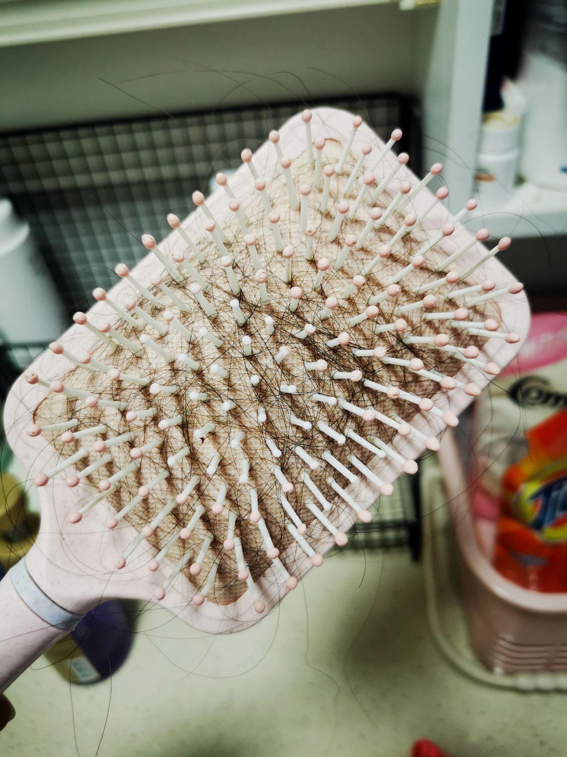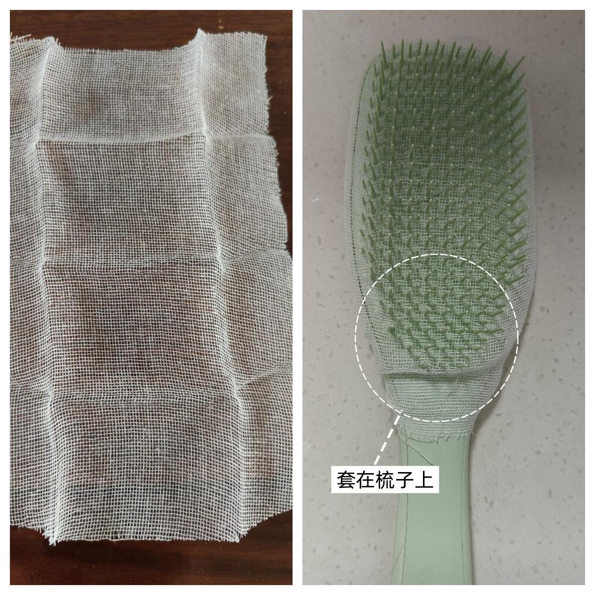 其實不需要額外花錢買什麼清潔工具。咱們家裏要是有醫用紗布,直接透過梳齒套在上面就行,等頭髮纏多了,一次性把紗布取下來,就立馬乾淨了~