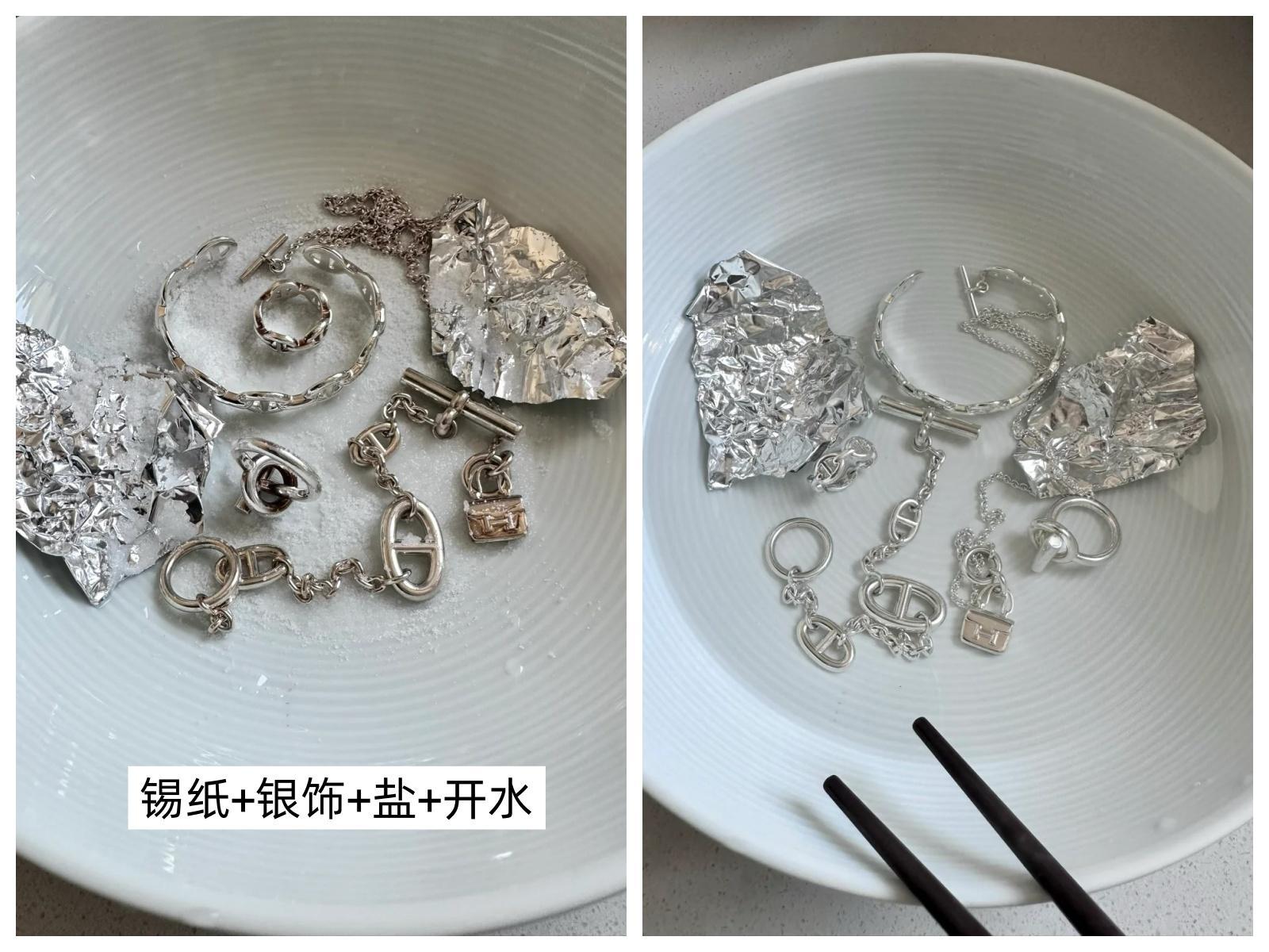 家裏有錫紙的,撕一點和發黑的銀飾一起丟進碗裏,然後再加點鹽,最後用開水燙一下,沒多久銀飾就恢復如初了,特別的簡單!