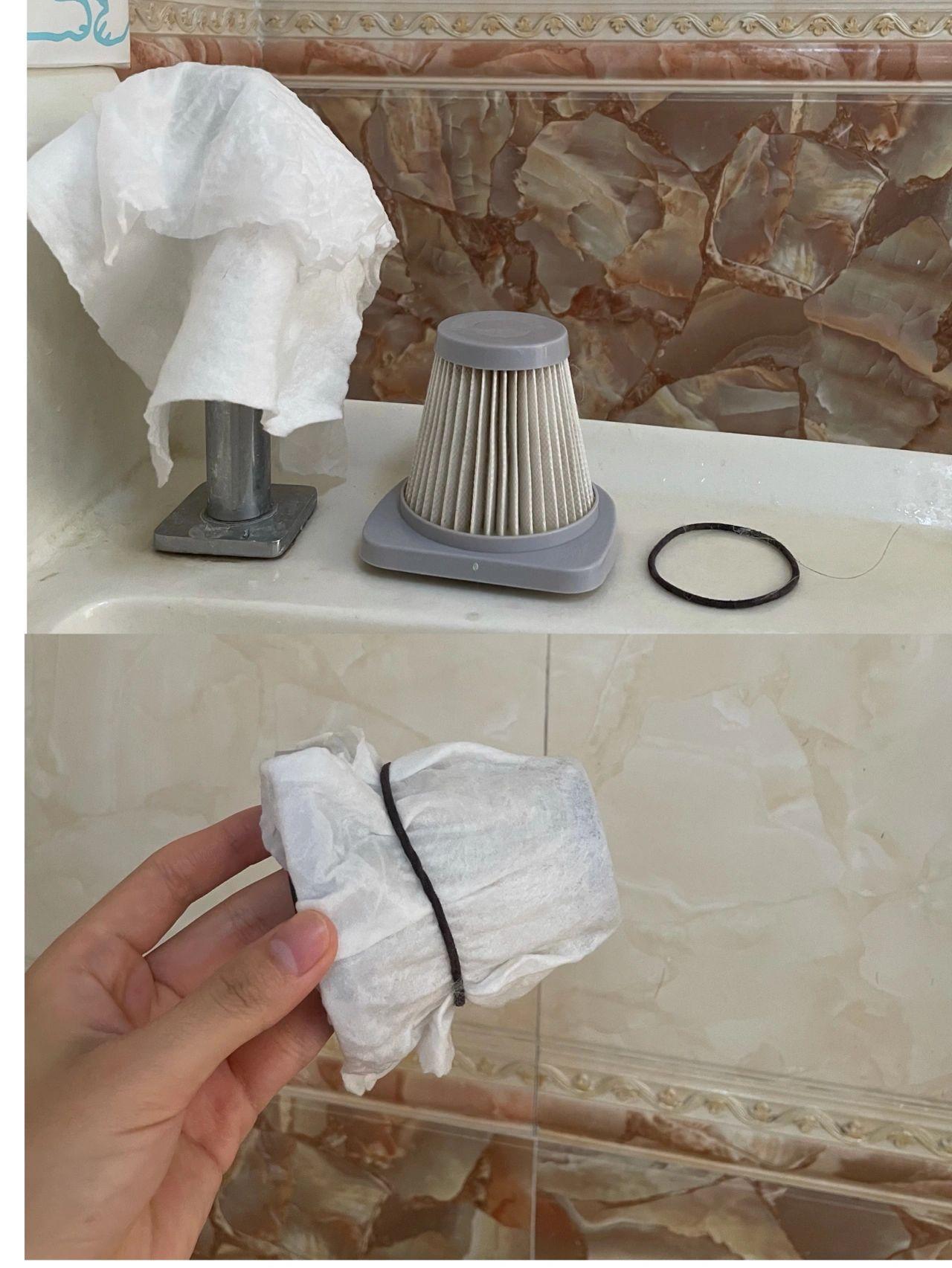 家裏要是有吸塵器的話,用橡皮筋把廢舊棉巾套在濾網上,可管用了。