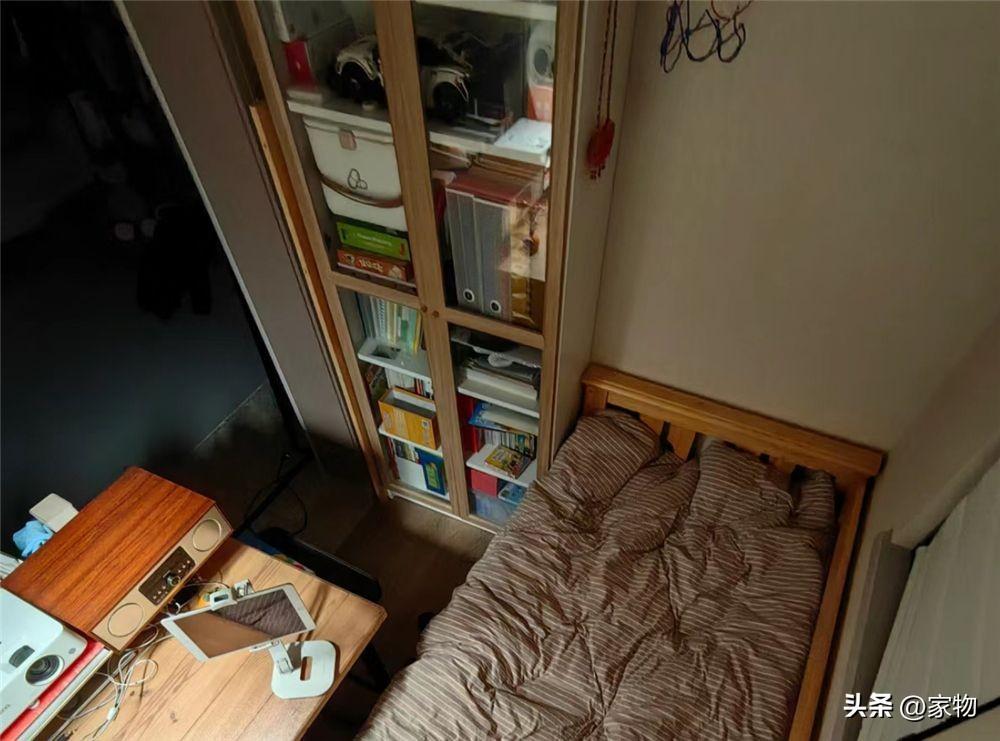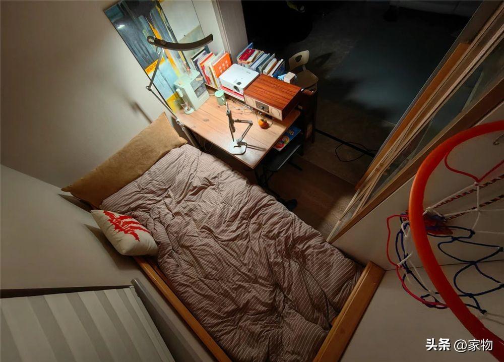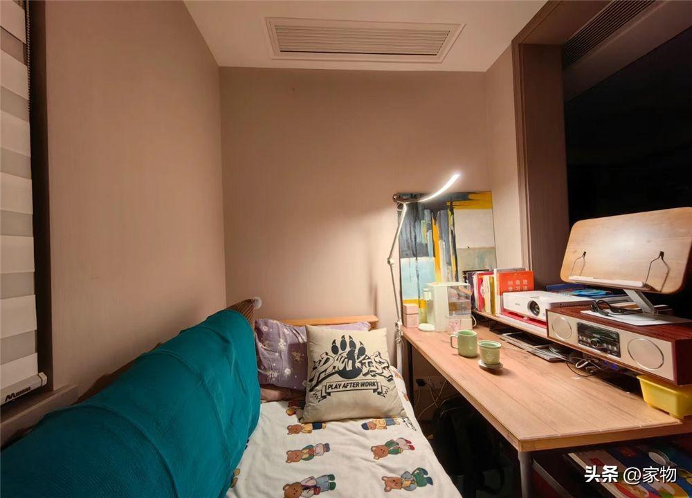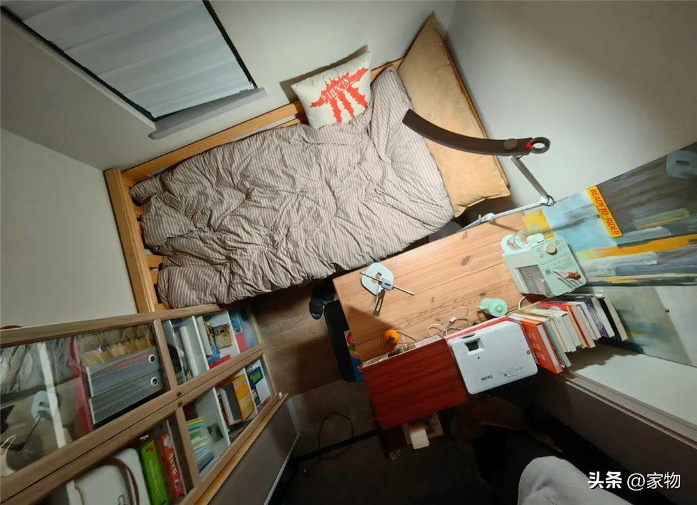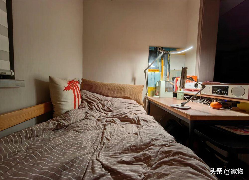 這間4㎡的臥室內,桌面上還有音箱、投影儀、平板電腦等一系列設備,如果是我的話,在這裏待一整天不下樓都沒問題,渴了喝喝茶,困了睡一會,想想就爽。