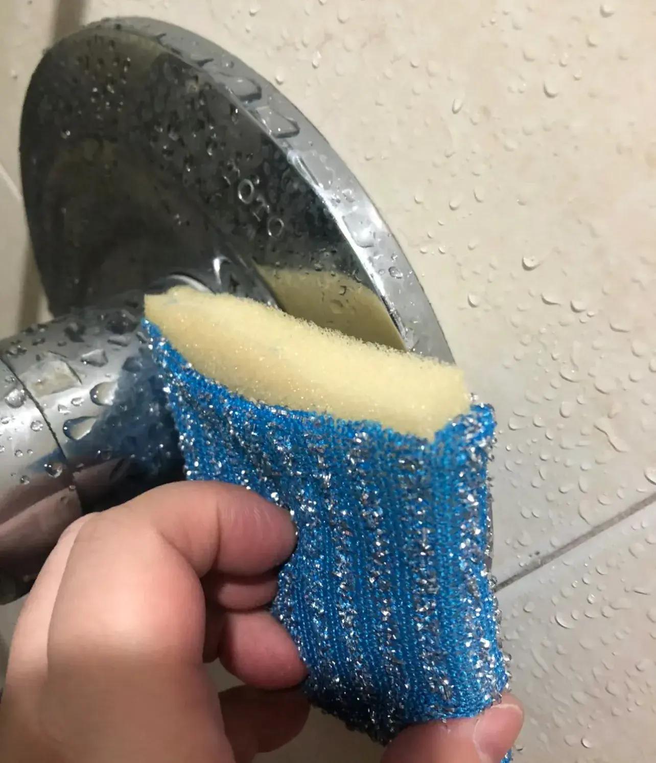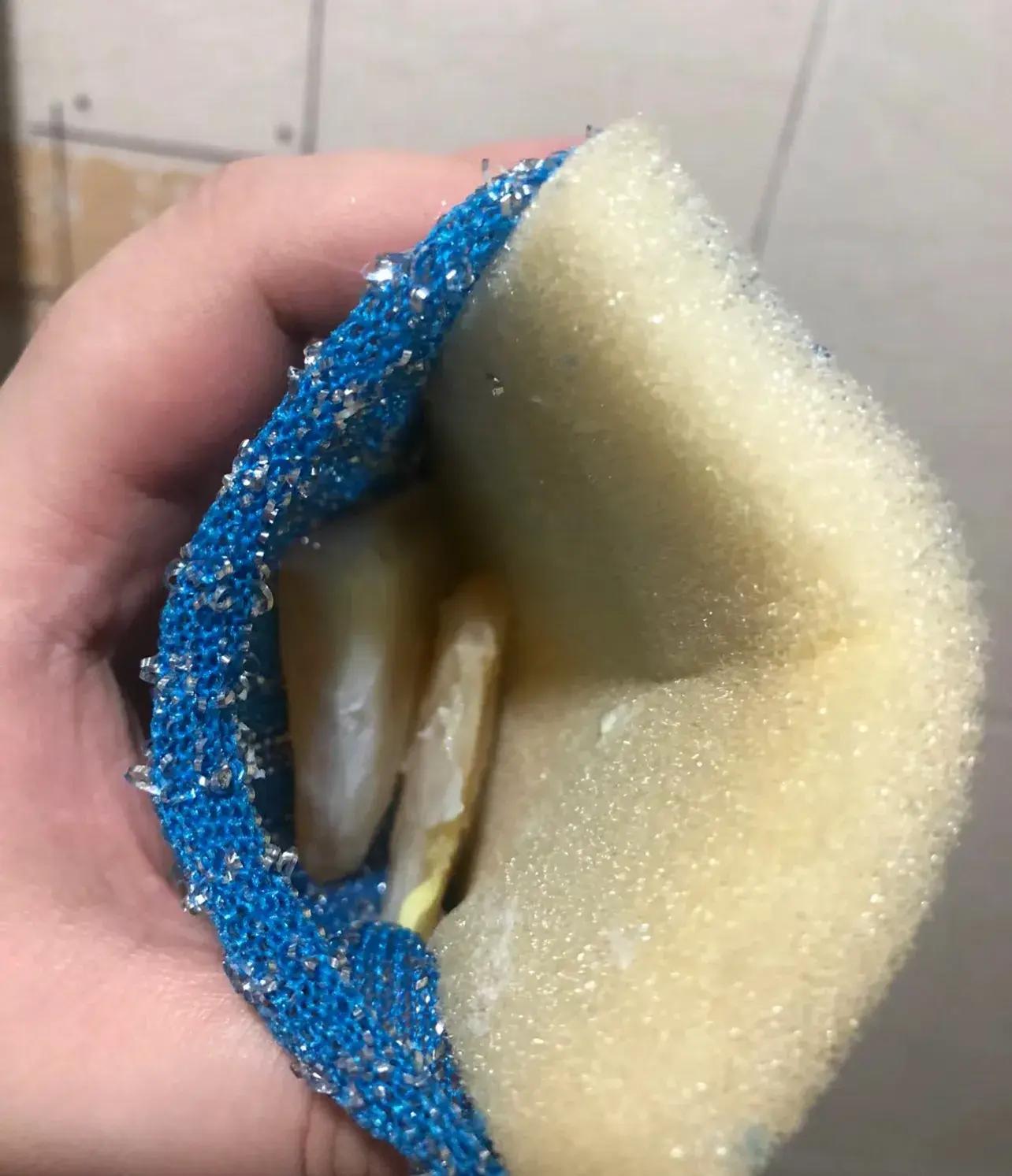 家裏百潔布,肯定都有,給它剪個口子,把小塊香皂塞進去。