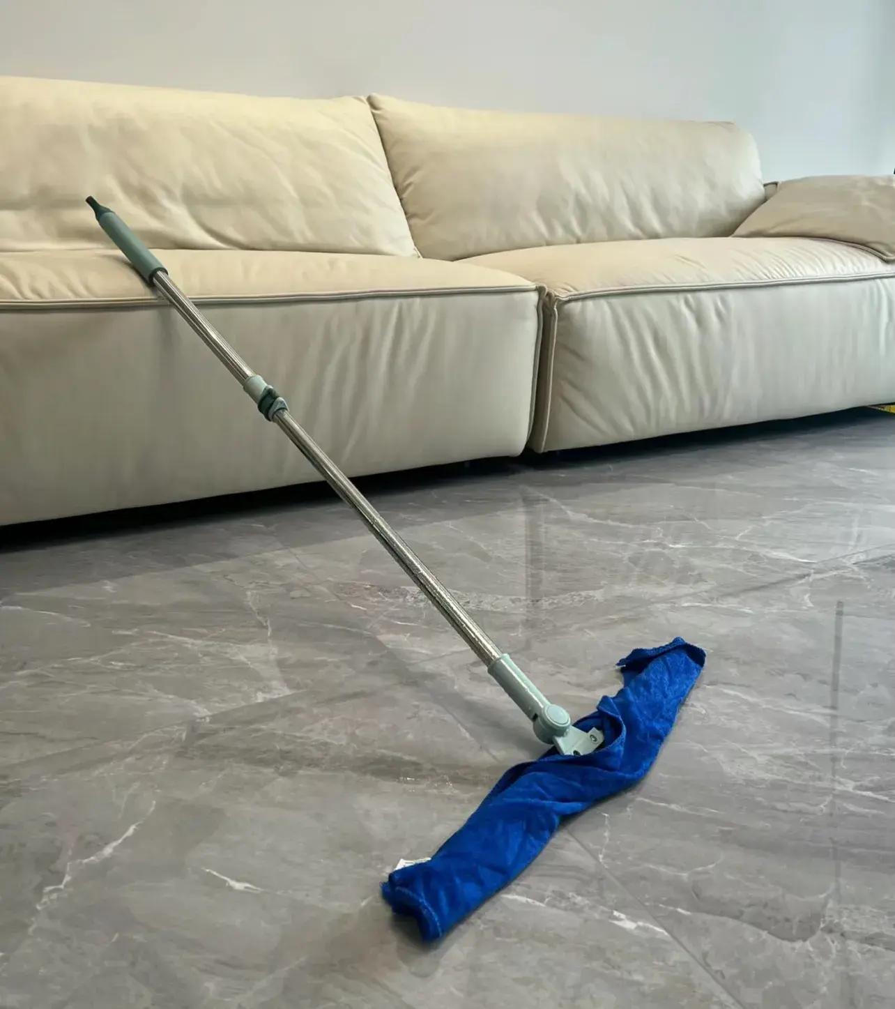 硅膠掃把也能辦到,給前面綁一個抹布,最好是能吸水的那種,拖地又輕鬆又幹淨,還沒有水漬。