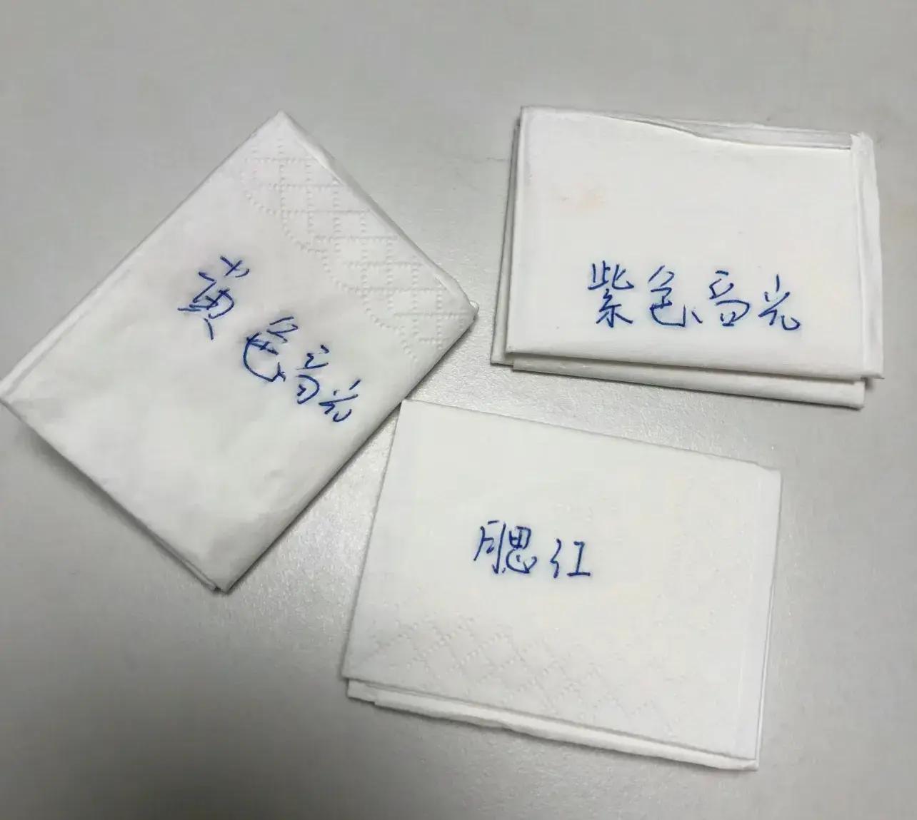 粉狀的腮紅、高光等:就挖一點,用紙巾包起來。