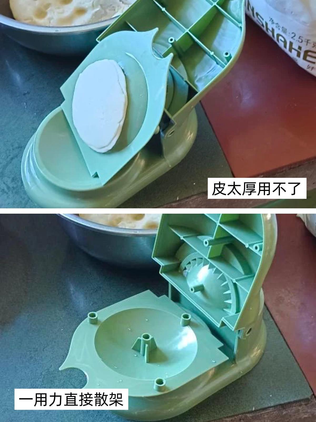 一拿到手裏我笑了,哈哈,這不就和我家孩子玩橡皮泥的工具差不多嗎?實測一下更是讓人無語,這哪裏能壓出來餃子皮?壓出來都要和煎餅一樣厚了,稍微用點力直接散架,關鍵這塑料材質是否是食品級也不得而知,避雷!