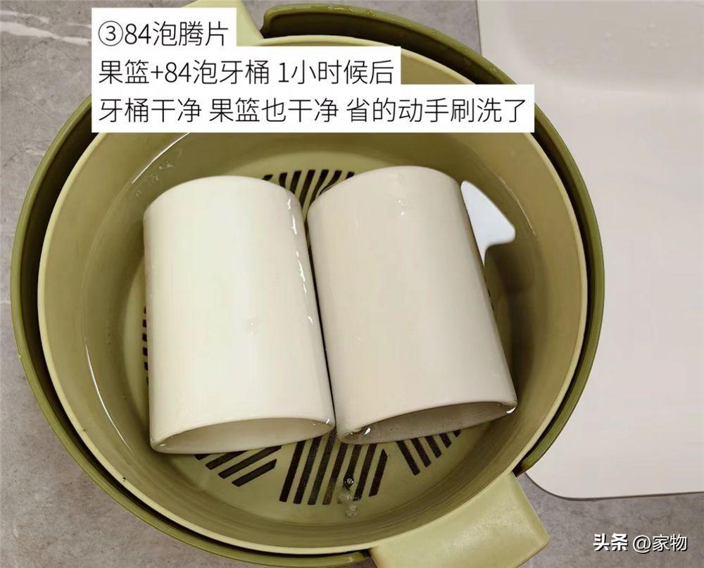 最後,那種84泡騰片也可以用來清洗籃子、牙刷杯等物,泡起來放一片,又能消毒,又可以快速去除污漬,省去手洗污漬的麻煩,但記得還是得沖洗一遍哦~