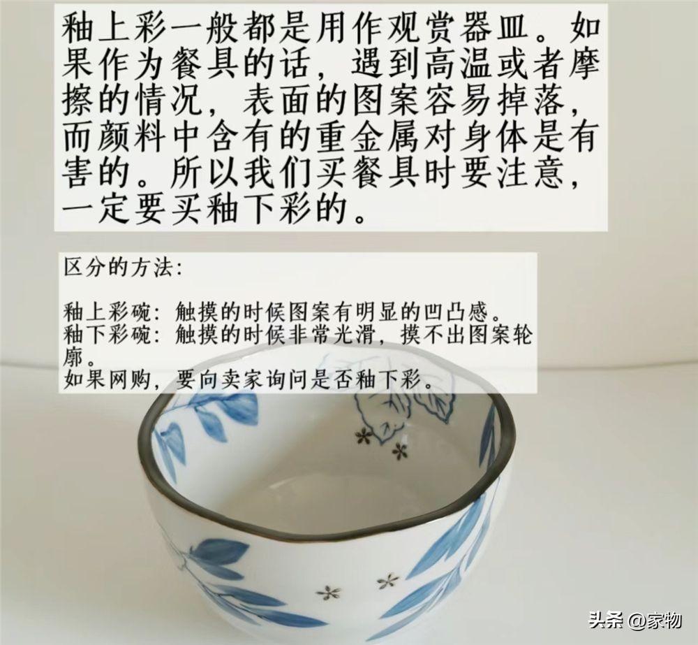 餐具分爲釉上彩、釉下彩、釉中彩,大家不用理解太深,就簡單理解成上釉和燒製方式不同,我的建議是儘量買釉下彩的,最起碼是釉中彩,釉上彩的釉料浮在外面,長期接觸熱食還是有些隱患噠。