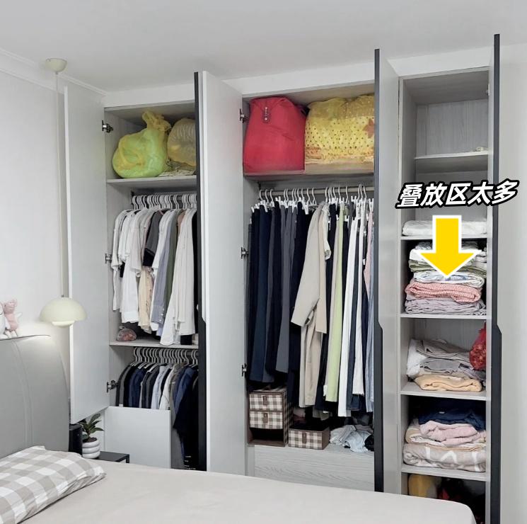 而疊放區,其實只適合放一些內衣,襪子,毛巾等小件物品,這些物品並不需要很多空間,也不怕皺。所以,定製衣櫃的分區,往往不符合我們的實際需求,讓我們的衣服無法得到合理的收納。