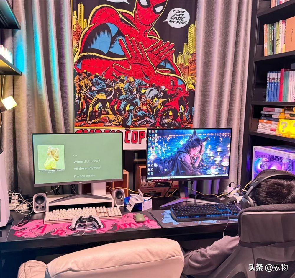 哦對了,窗戶的位置除了遮擋光線的窗簾以外,還掛上了一張蜘蛛俠的海報掛毯,也算是兩個人共同喜好的角色,更爲這間電競遊戲房增添了一抹鮮明的紅色。