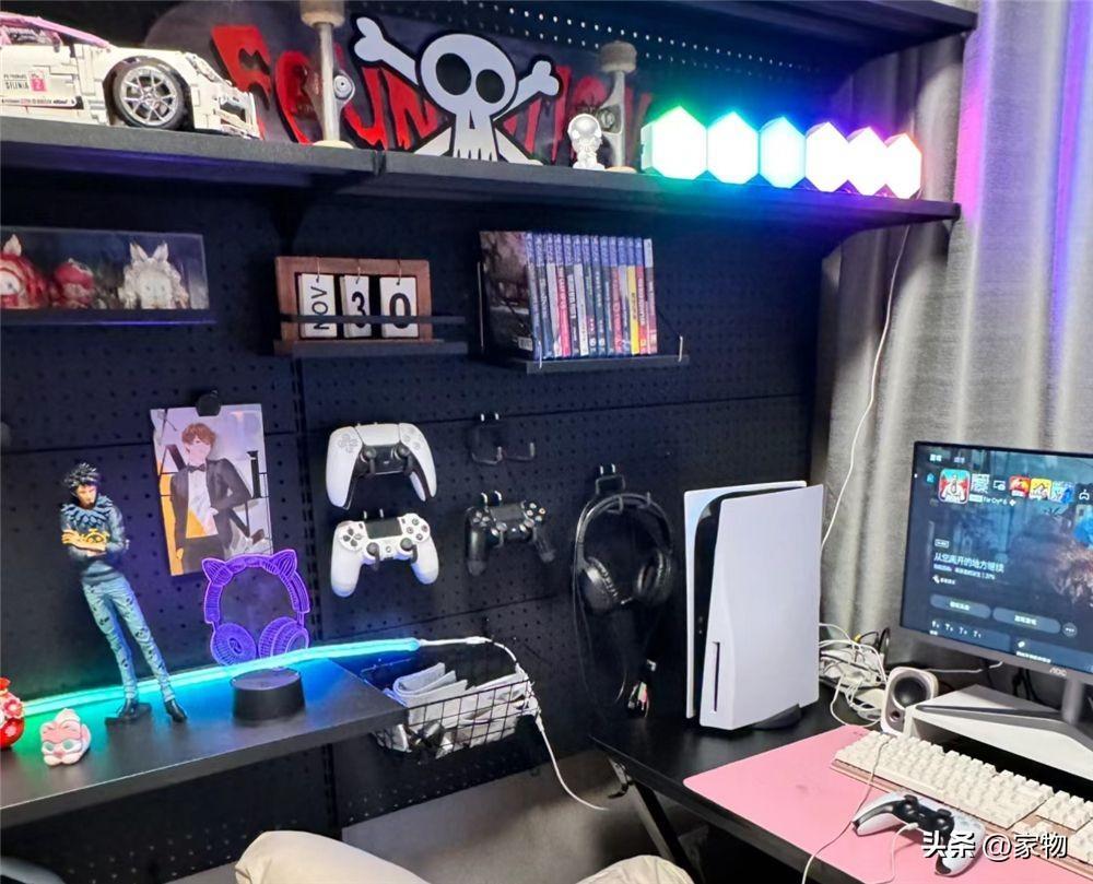 這些洞洞板上的收納用品,也可以按照收納物品的需求變換位置、高度,個人感覺靈活性還是非常不錯的,這對夫妻也會在這裏收納手柄和遊戲盤,更有電競遊戲房的感覺。