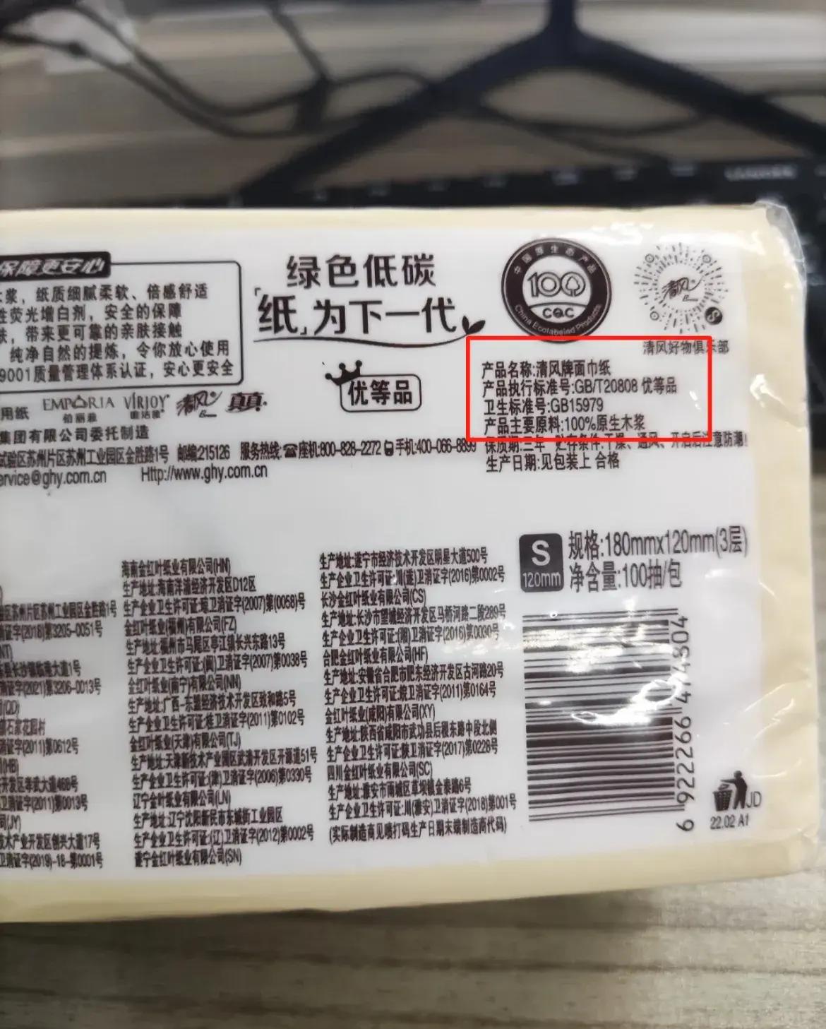 除此之外,細心一點的人會發現,品牌抽紙的主要原料都是100%原生木漿,而其它則有標註原生木漿的、有百分比打折的,還有一些植物纖維的。