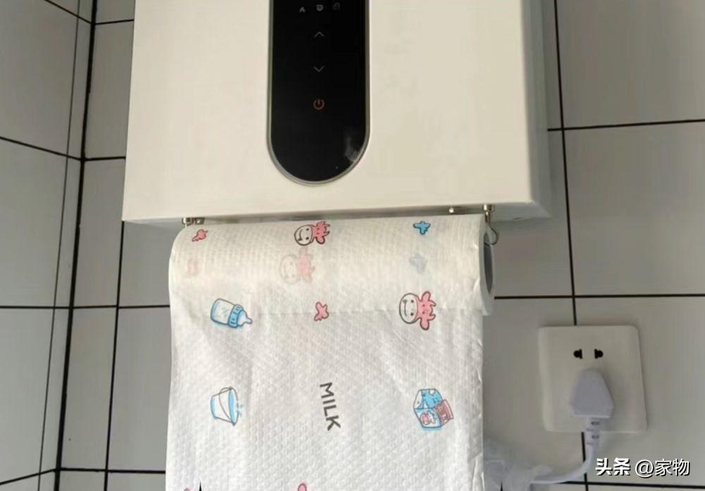 如果家裏是用的那種燃氣熱水器,其實可以裝兩個磁吸掛鉤,裝上一卷廚房紙,也就自然擋住了下面突兀的燃氣管路,這樣做還有個好處,就是將尷尬空間利用了起來,扯紙很方便。