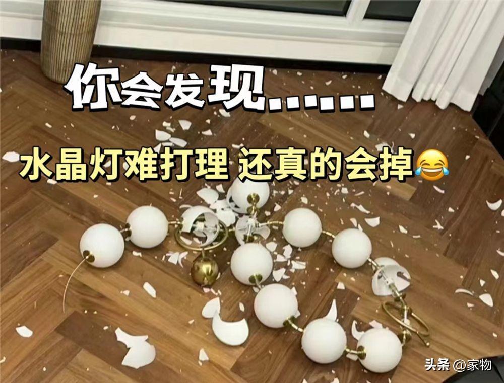水晶吊燈我就不建議大家做,先說清潔打理,因爲結構複雜,有更多角落容易積灰落塵;再說燈身本體,既貴還會壓低層高,安裝不當甚至會有掉下來的風險,真心不合適。