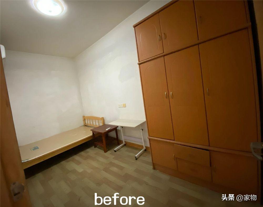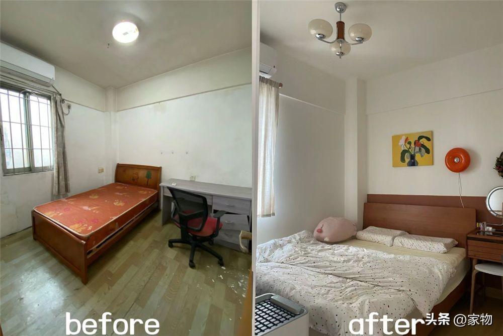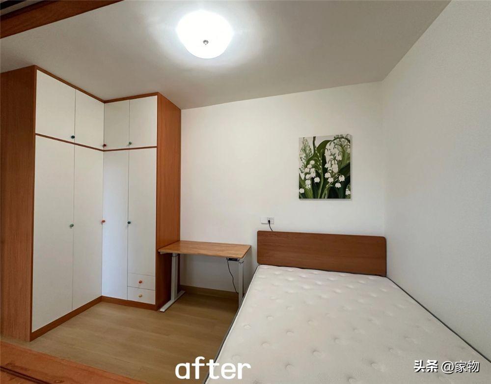 主臥室的面積略大但也有限,之前也是放了張單人牀,旁邊放張桌子,看起來特別簡單,當然牆面髒舊,視覺效果看起來也很破敗;裝修後,換成了雙人牀,空間仍舊緊湊,但溫馨了很多。