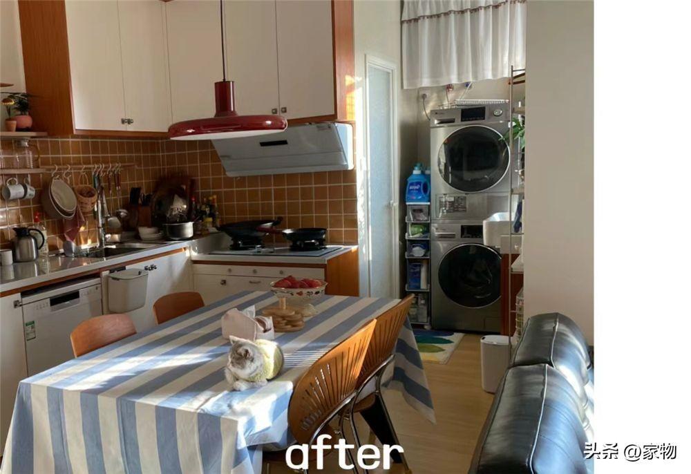 牆面內移、廚房開放後,將封閉廚房變成了陽臺,歸還了陽臺的作用,洗衣機+烘乾機的搭配,也讓家裏清潔洗衣變得格外方便,省去了晾曬衣物的空間。