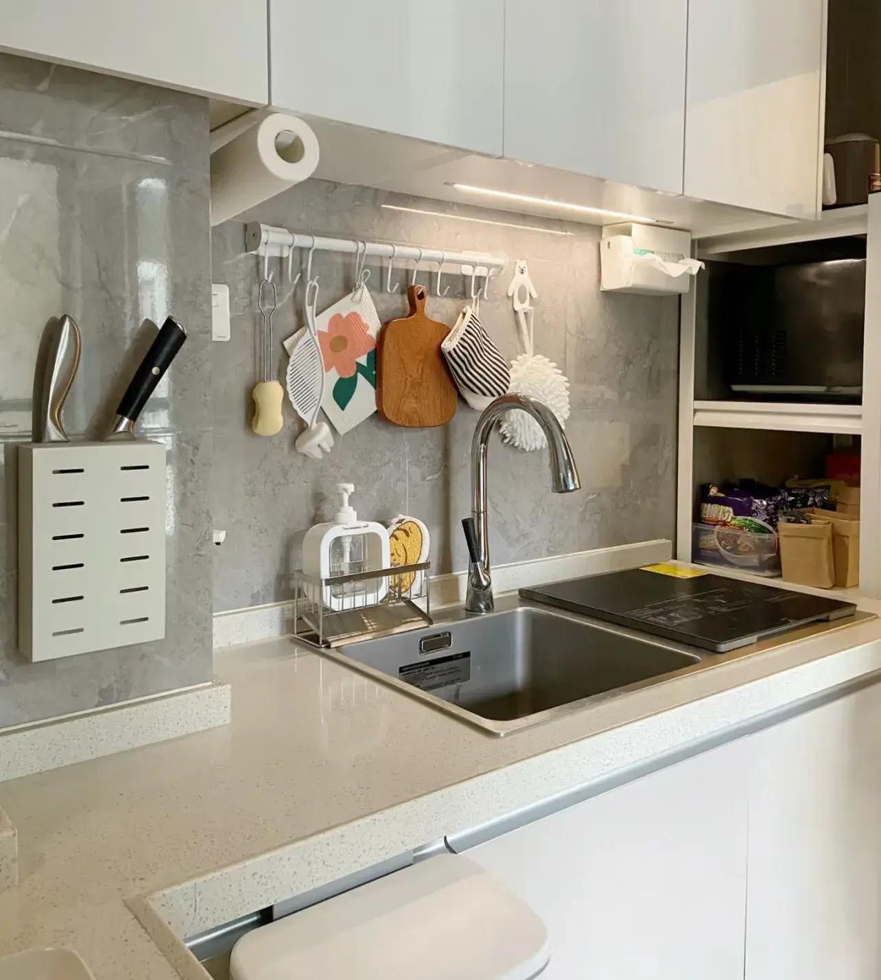 因此,還是掛起來最方便,當然,考慮到顏值,一方面是挑選這些小物時儘量精緻;另一方面是,杆子越簡單越好,顏色與廚房呼應。