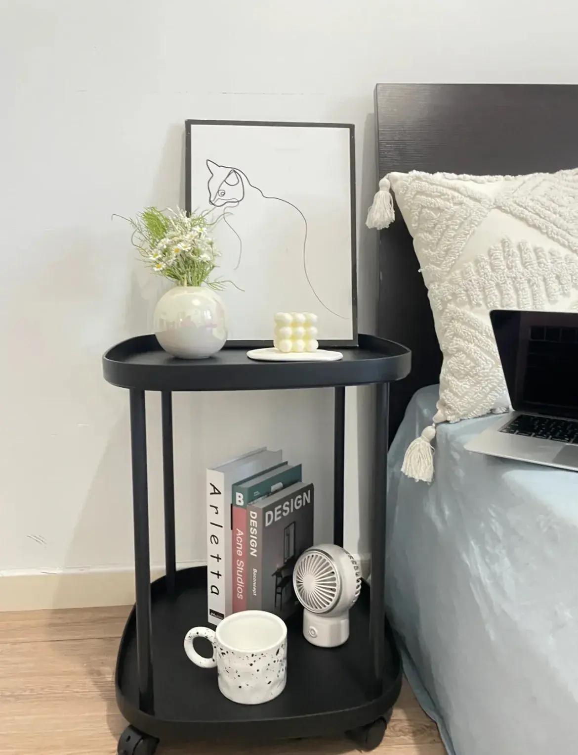放完衣櫃、牀的臥室,已經沒有空間去支持固定位的牀頭櫃了,也用小邊幾替代,因爲底下有輪子,挪動方便,再開衣櫃門,也不會有阻礙感。