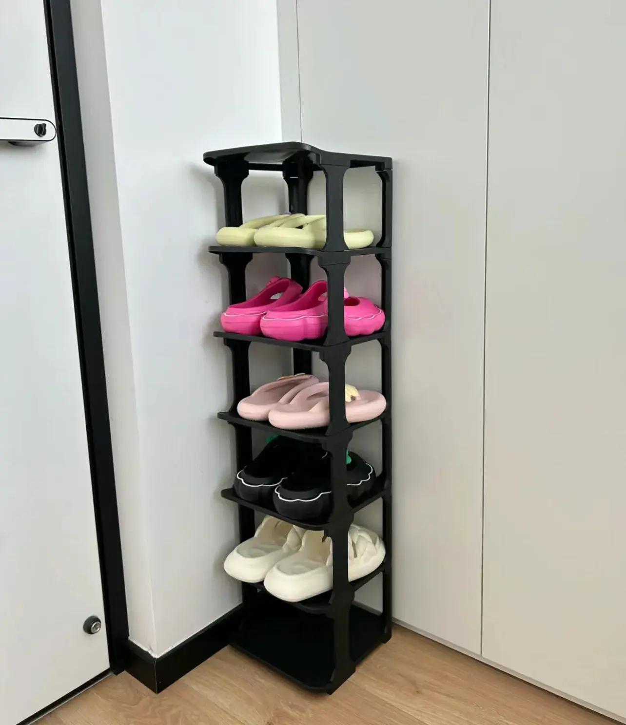 不管哪種情況,我都建議給門口增加一個開放式鞋架,不要哪種寬而低,佔地方又顯亂的,要這種縱向鞋架。