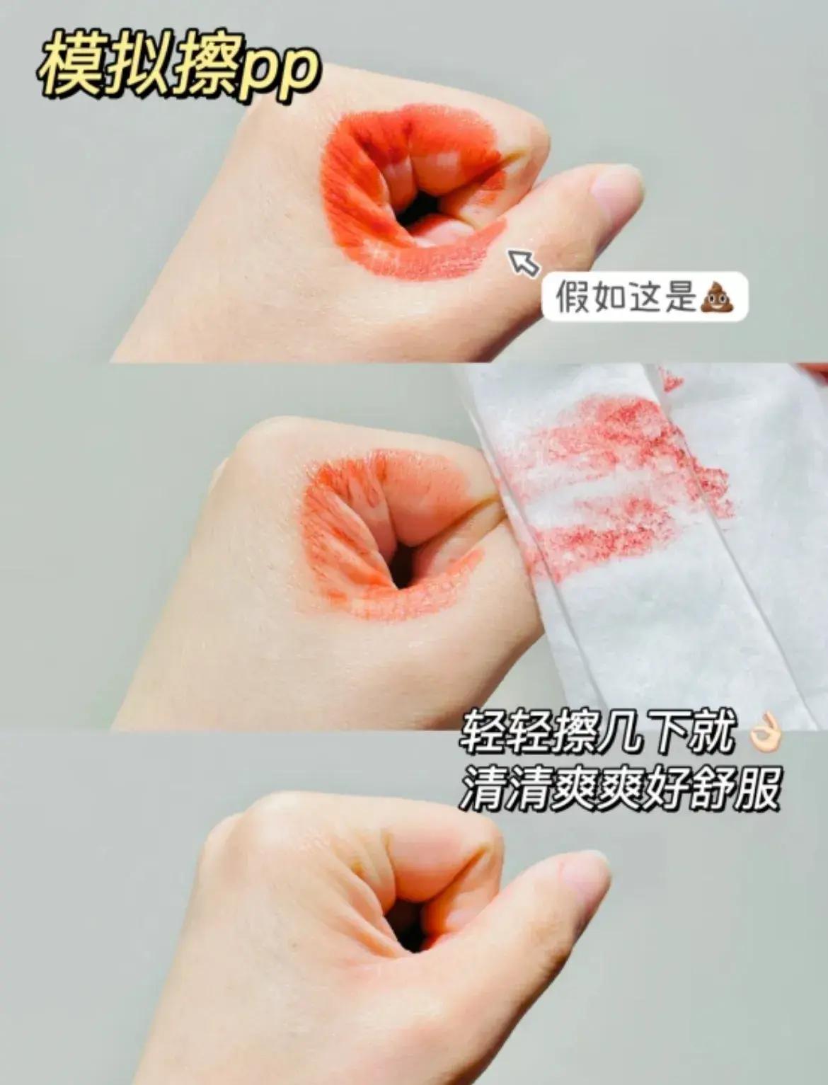 爲了更直觀點,用最簡單的方法,口紅模擬,輕輕擦幾下就跟洗過一樣乾淨,方便又省事,也絕不是衛生紙就能達到的清潔程度。