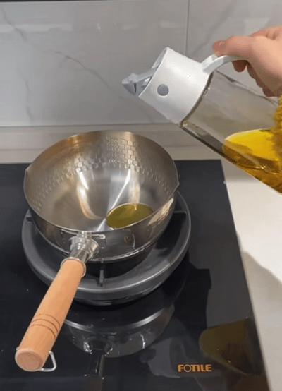 這種能自動開蓋且不挑速度、無論姿勢,都能順利出油的油壺就很好用,單手操作,不至於手忙腳亂,倒完的瓶口乾乾淨淨,不用徒增家務。