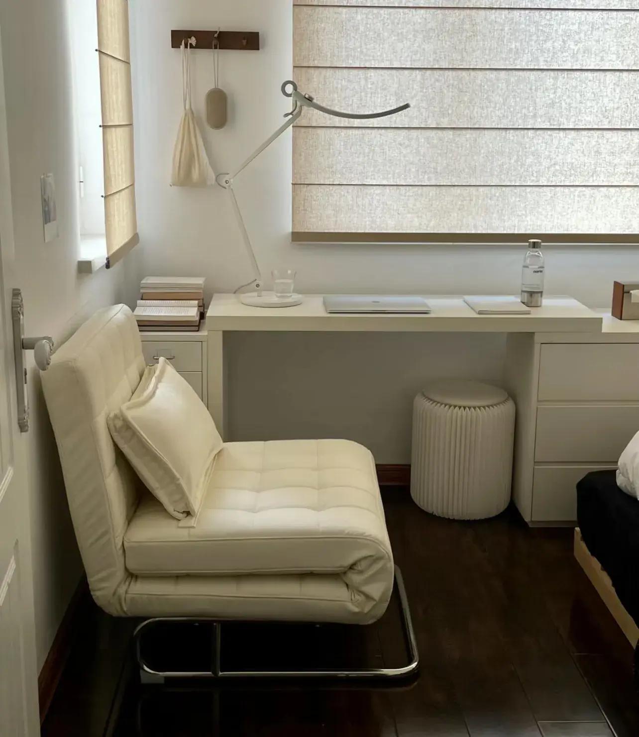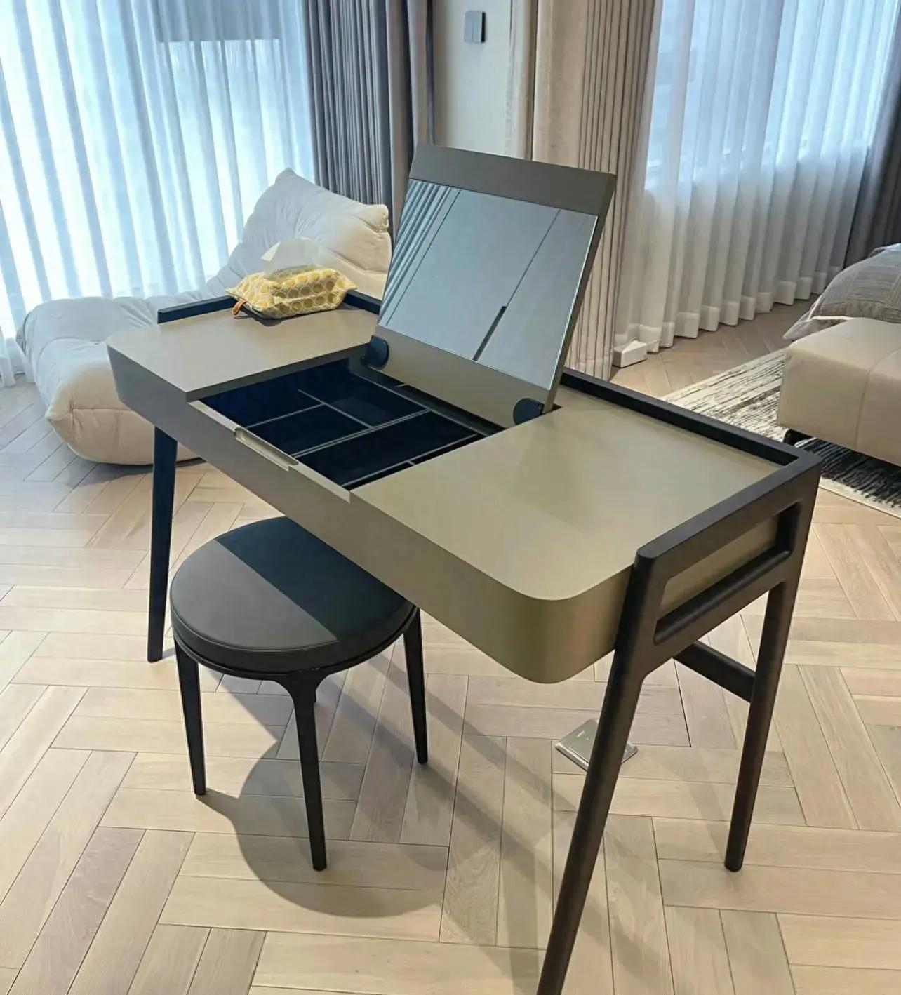 其次,腿伸展不開,不舒服。小小的一個梳妝檯,既要有桌面還要有收納,勢必會壓縮腿部活動空間。