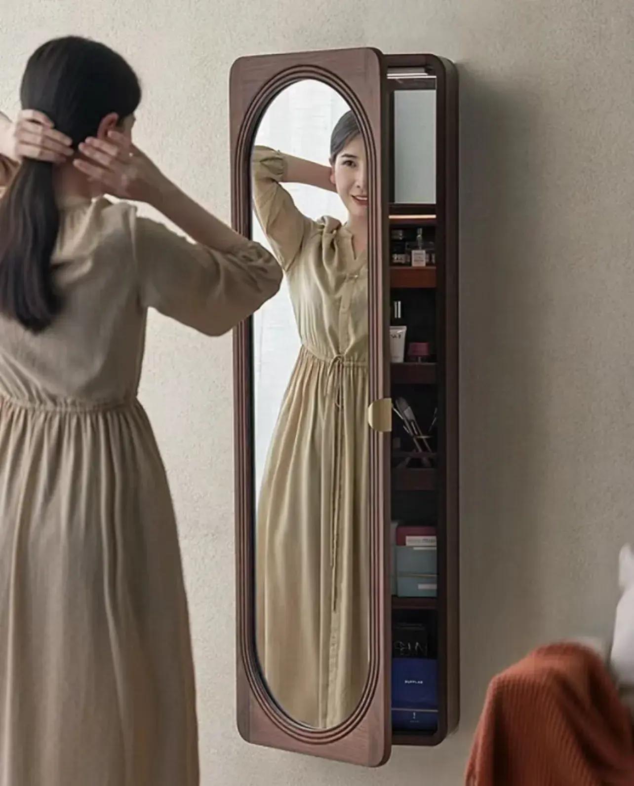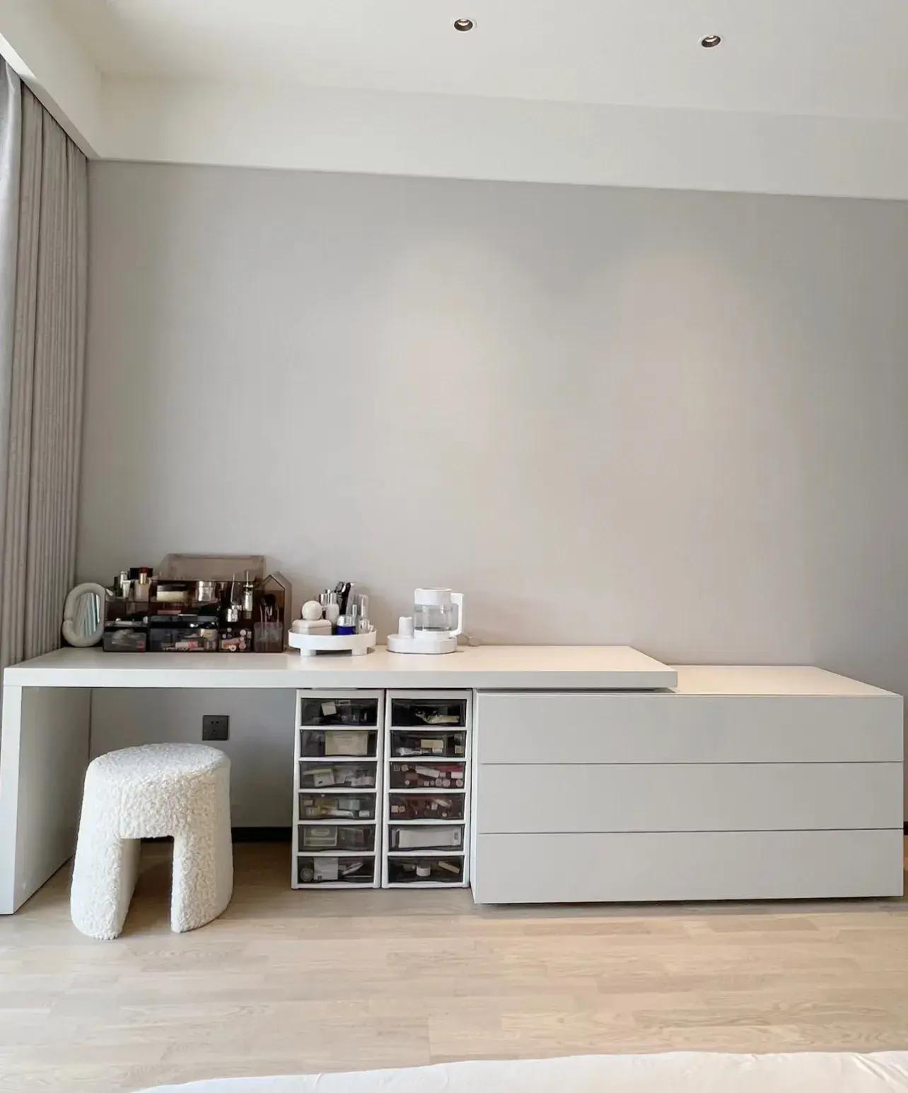 能化妝的地方有很多,除了衛生間鏡子,書桌上添個鏡子、化妝品收納盒做個化妝角;牆上做一個全身化妝鏡櫃;牀尾鬥櫃做一個化妝角……都行。