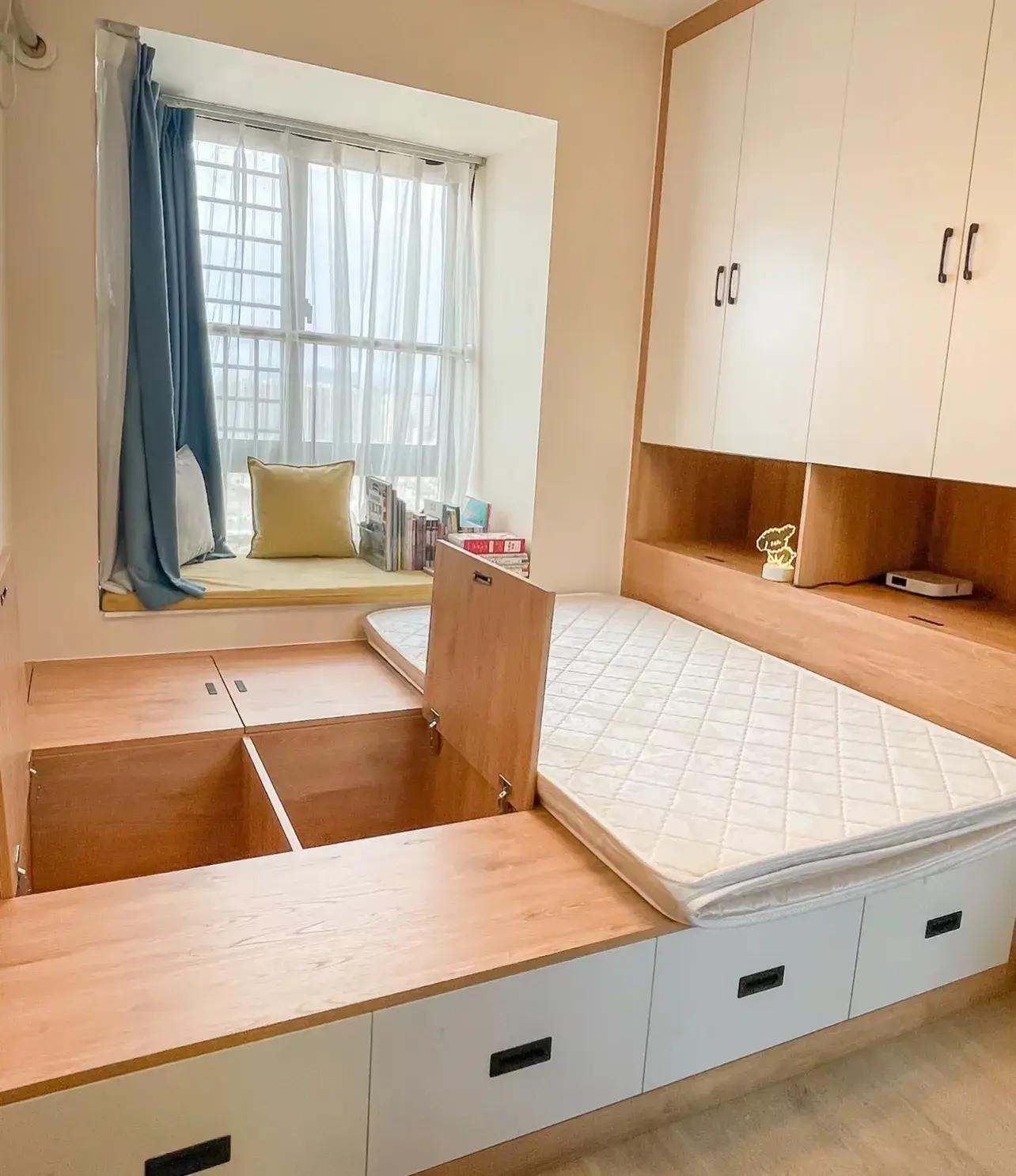 其二,儲物看着大,但是它不中用,拿取極爲不變。牀箱體,不方便得揭牀墊才能取東西;櫃子裏的東西,得脫鞋上牀才能拿取,還經常門板跟被褥打架。