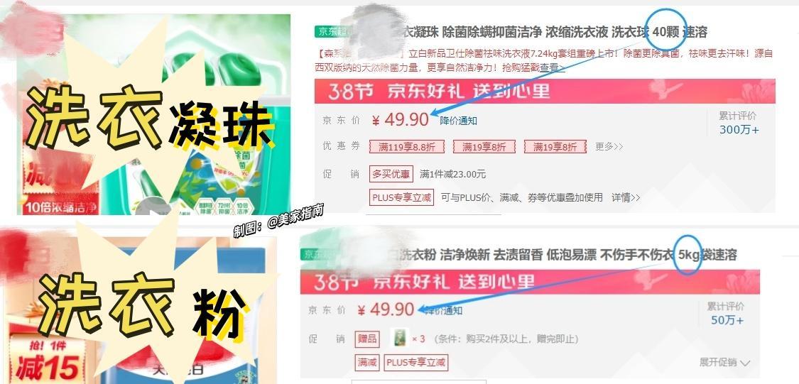 不過爲了增加說服力,我還是去某電商平臺,找了某一線品牌的“洗衣凝珠”和“洗衣粉”做了對比。如下: