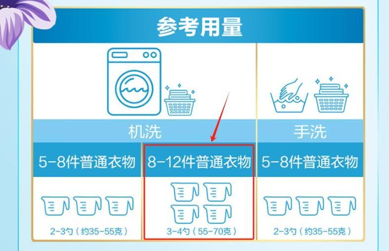 而同樣洗8-12件衣服,則需要洗衣粉3-4勺(55-70克),我們就按照10件衣服需要用60克來計算。