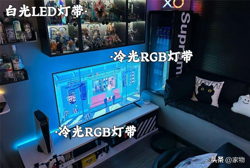 不得不說,這間臥室內諸多的燈具,真的是給室內氛圍增色不少,電競桌後面,最後一個角落的電競區,就在冷色調的氛圍燈烘托中自成一個遊戲空間,窩在這裏打遊戲應該也還挺愜意的。