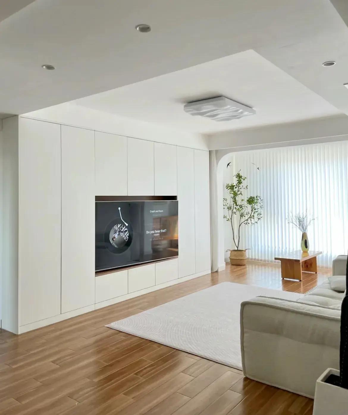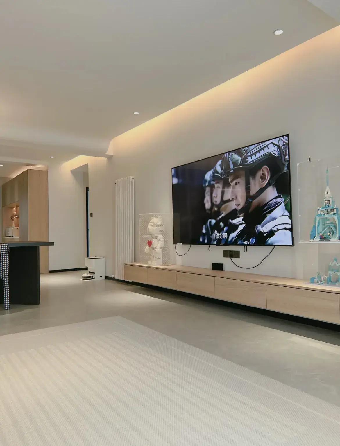 用木工板+燈帶做出懸浮牆,或者滿櫃電視牆,都是藏電視不錯的方案。