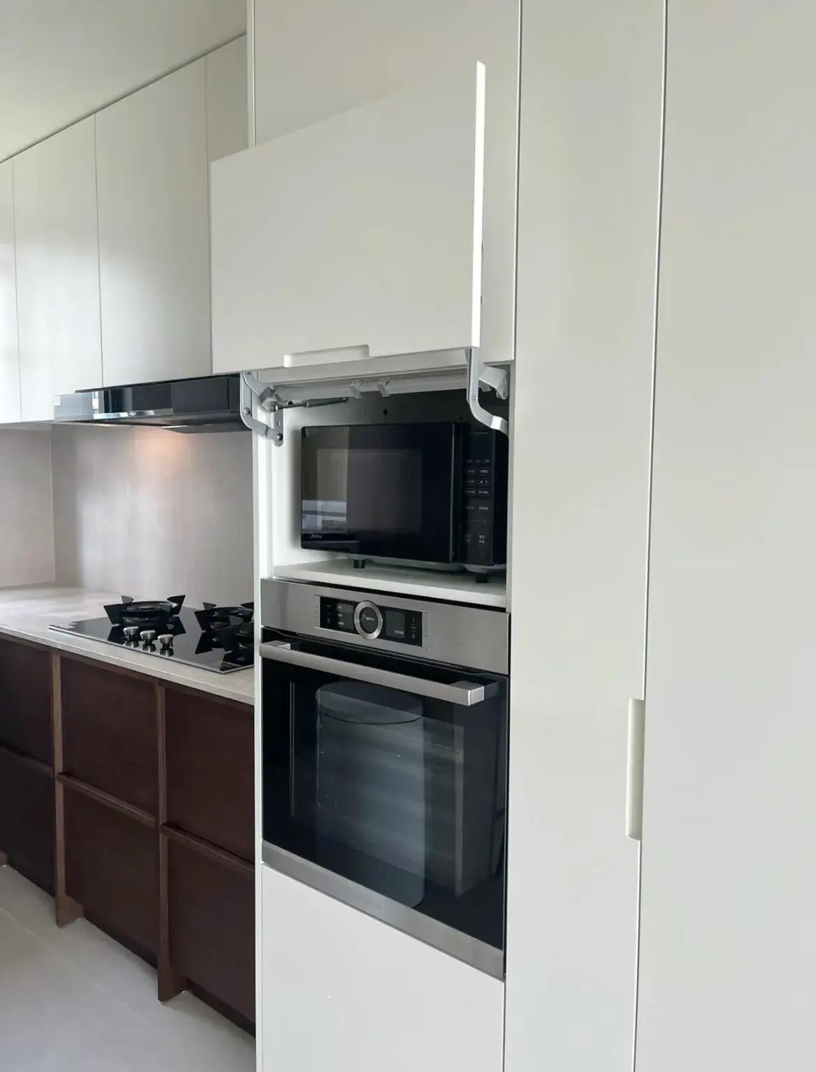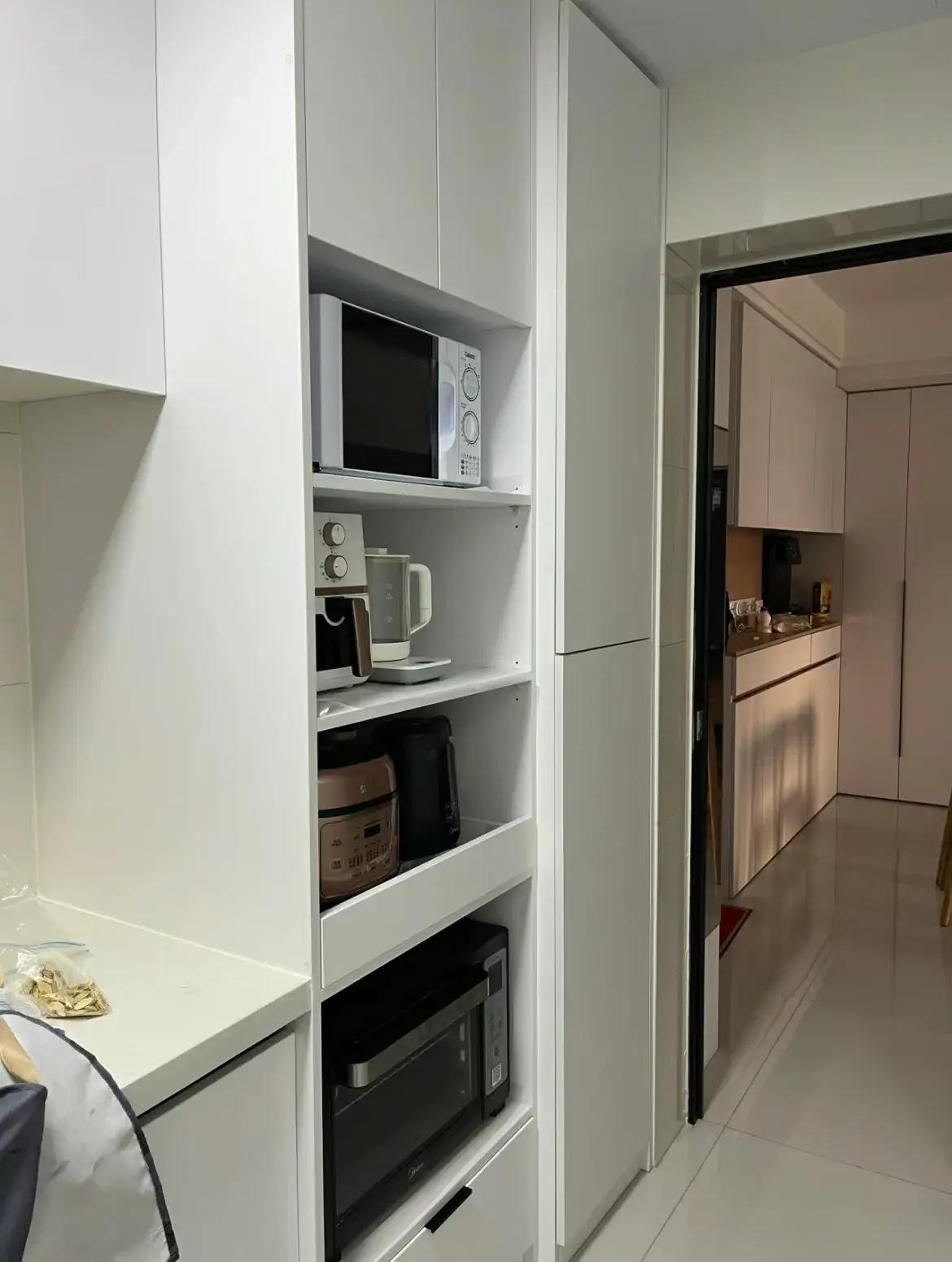 除了調料、鍋具等小件用品要收進櫃子裏,廚電也要最大程度藏起來。