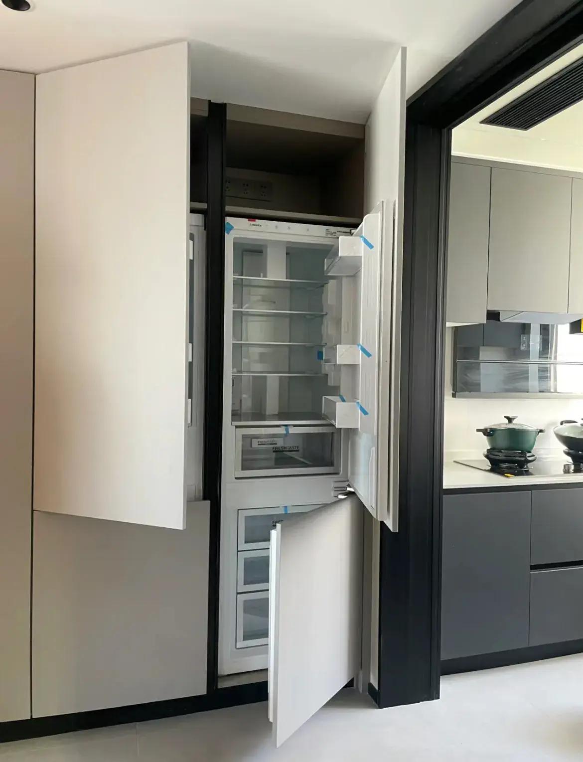 實際操作起來也簡單,選擇平嵌的冰箱,正面是齊平的,兩邊也不用太大的縫隙,一般2cm留縫就夠,出來櫃子與冰箱嚴絲合縫。