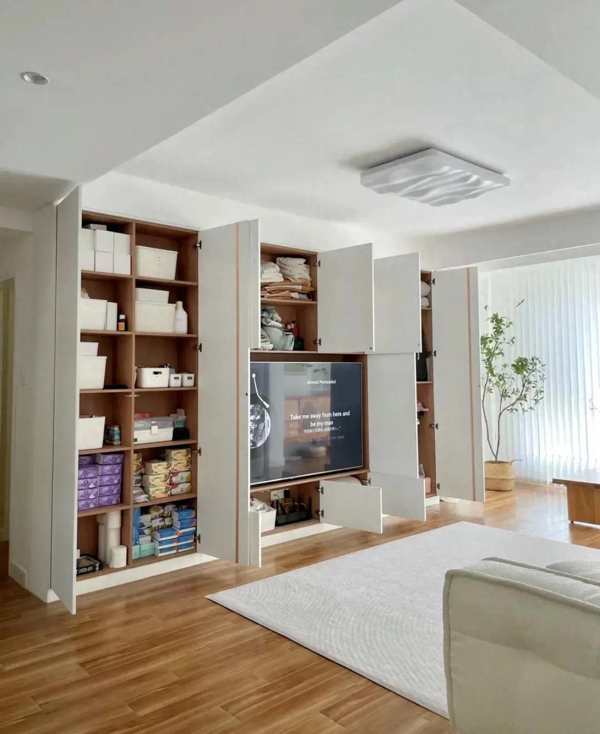 比如,客廳的電視櫃換成滿牆櫃,以客廳爲中心的所有雜物全部收納於此,位置又在家的動線中心,拿取也方便。