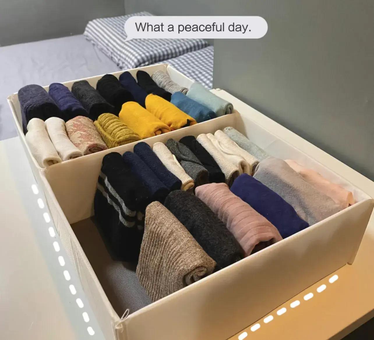 襪子可以立起來收納進盒子裏,既讓人感覺舒展,又找襪子方便,拿取襪子也方便。