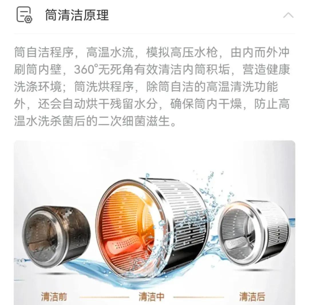 而且操作簡單,轉到筒自潔模式就能清潔洗衣機,除了高轉速能沖刷掉內外筒的殘留物,還有高溫洗,90度左右的溫度,能殺死大多數細菌和微生物了。