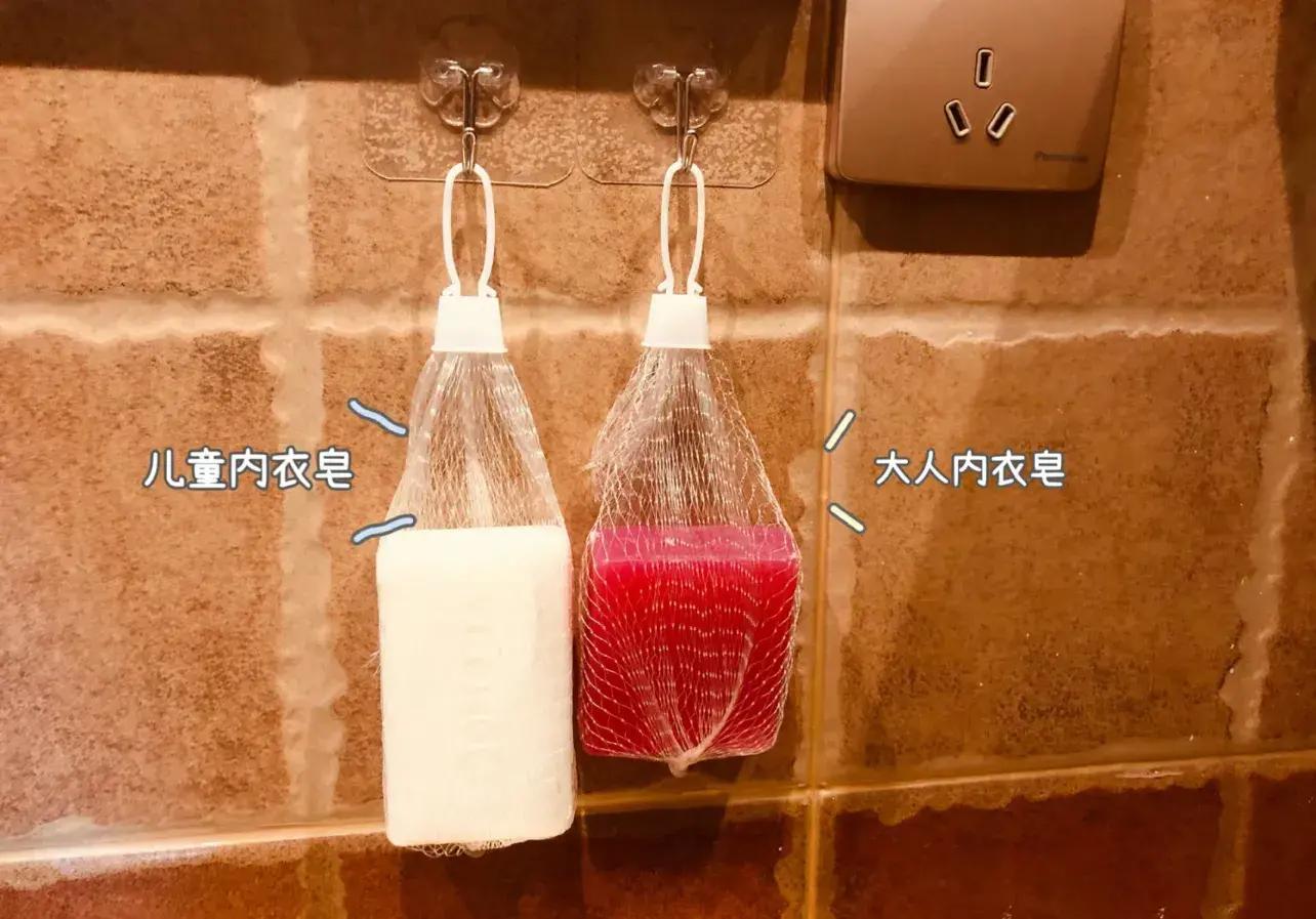 如果是淋浴區用的香皂,那就用網兜+網扣,10塊錢能買一大堆,給它裝起來。