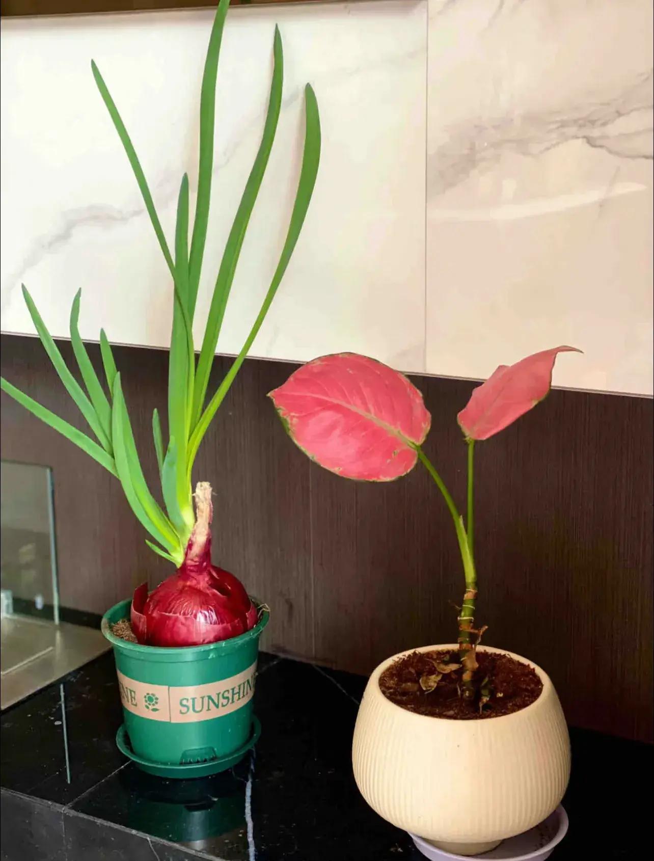 長了芽的洋蔥,直接往廢棄的盆一放,你別說,觀賞性還真的不比植物盆栽差多少。