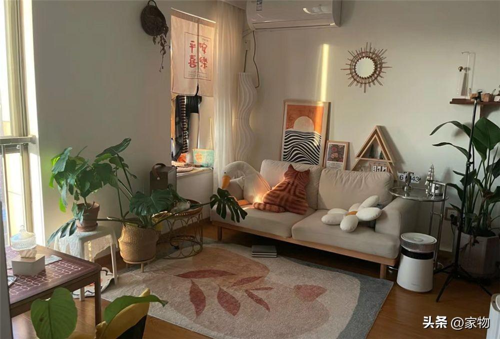 再往裏走,是家裏的客廳,其實對於一間50㎡的小家來說,這間客廳面積還是挺大的,沙發靠牆,中間鋪設地毯,另一邊是電視櫃,取消茶几做邊幾,空間足夠充裕。