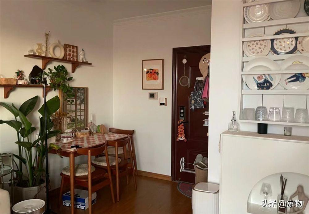 先來看看家裏的入戶空間吧,一進門就是個小小的玄關過渡空間,旁邊餐桌橫向擺放,一個人坐在這裏喫飯用餐空間還是足夠的,深色調的木質傢俱也帶來了些許復古感。